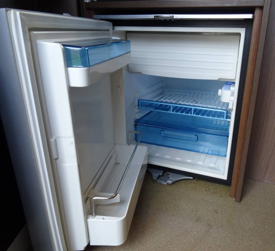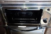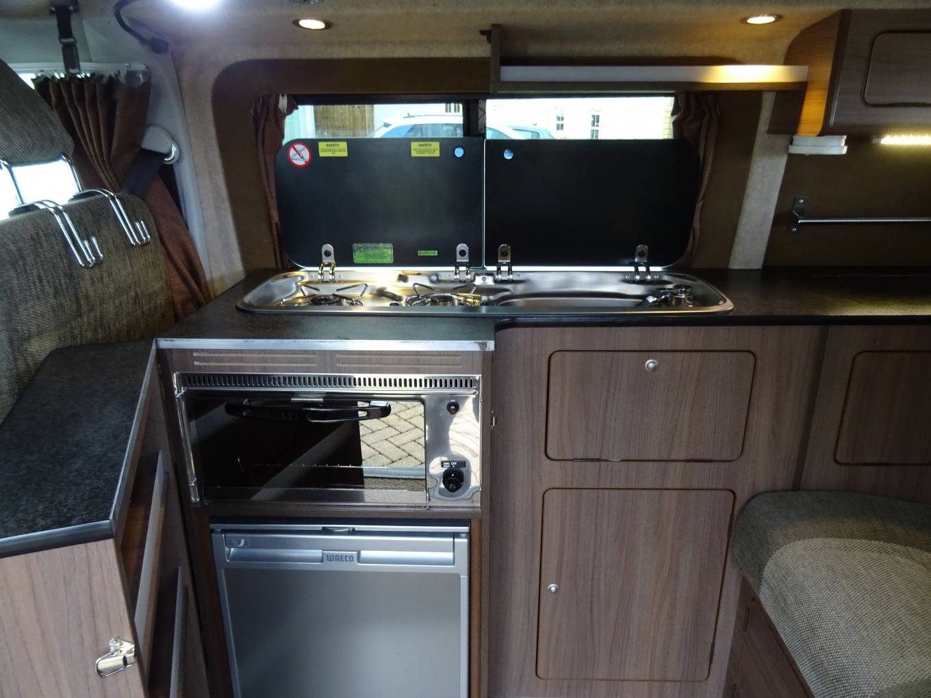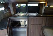The fridge and grill are neatly concealed behind a furniture door, having internal recessed shelves for spices and condiments. Throughout the camper there is attention to detail and a surprising amount of storage cupboards and shelving.