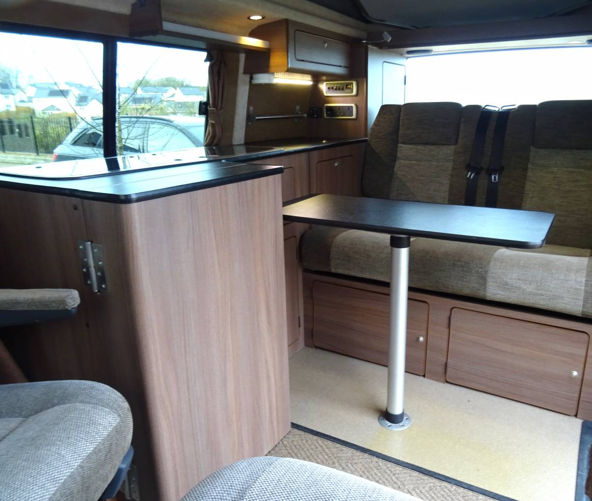 t's a 4 berth, 4 belted campervan with a Rib R&R bed and additional double bed above in the forward facing pop top roof. The front seats swivel to create a great area to dine and relax in once you have reached your destination.