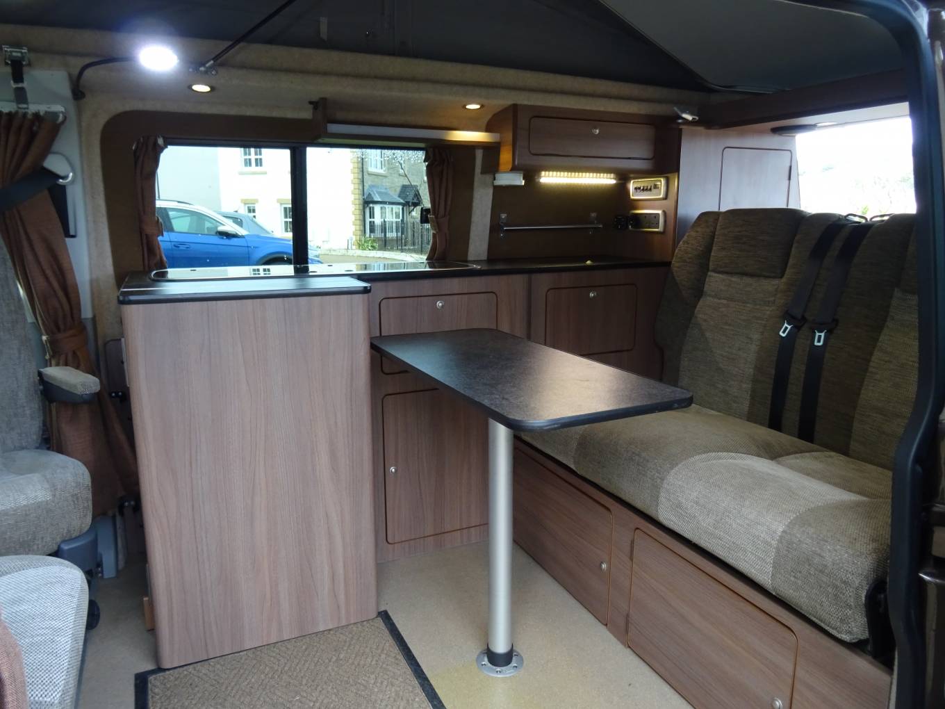 The camper also features on board fresh and waste water tanks with hot and cold water, alongside other great specification including Eberspacher diesel heating, hob, grill, fridge. There is also an external shower at the rear, ideal for rinsing muddy gear before retiring indoors. In the living space, a good sized pedestal table is available for the dinette, which easily stows away when not in use. All the fixtures, fittings and upholstery are of high quality and in excellent condition and there is ample lighting.