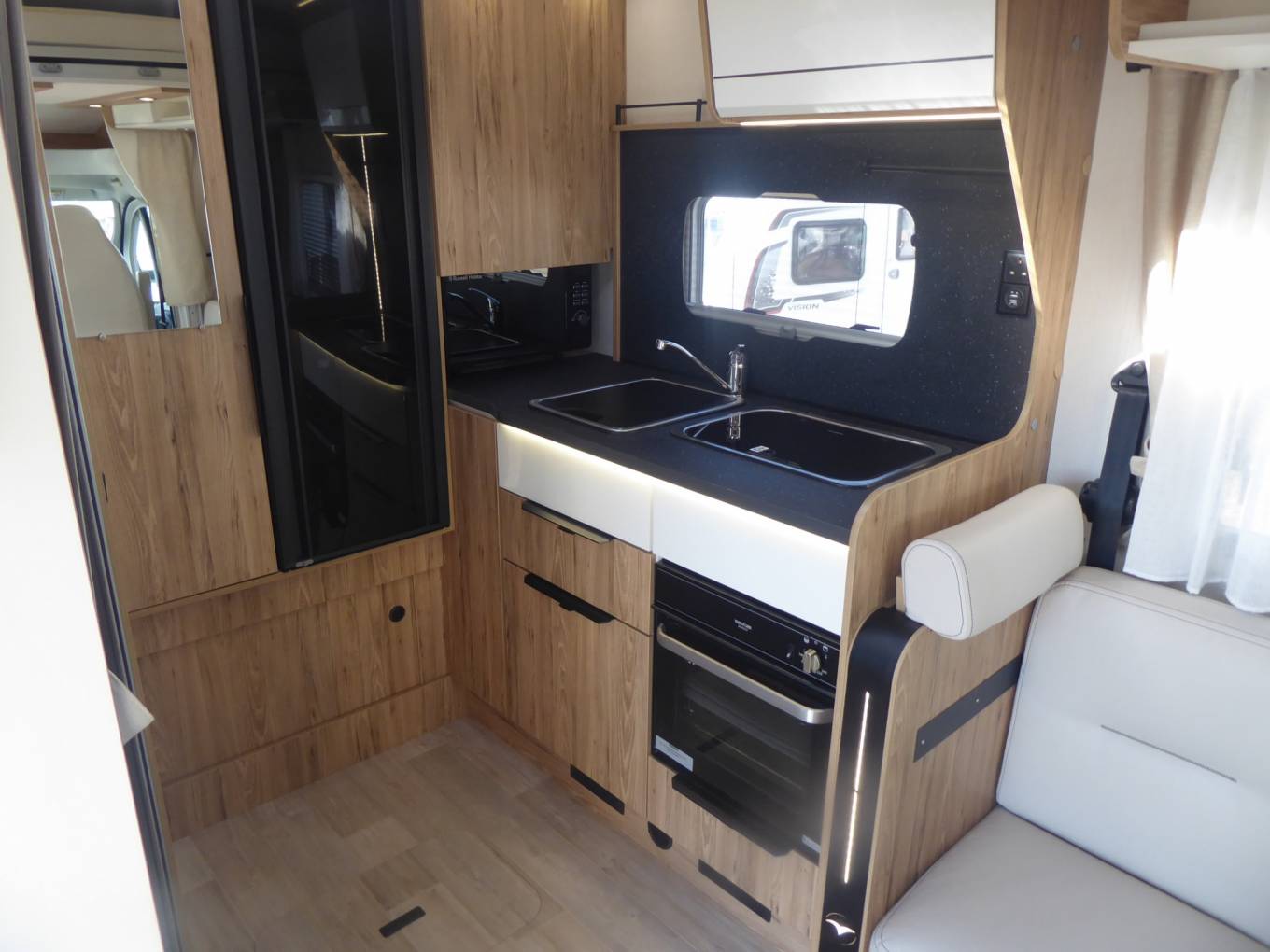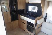 At the nearside rear of the habitation is the kitchen which comprises a hob with 2 gas burners, a combination oven/grill, an oven, a sink, and a microwave. There is a fridge with a freezer box along the back wall, next to a wardrobe storage area.