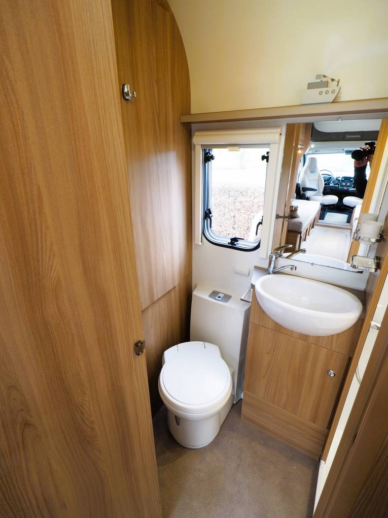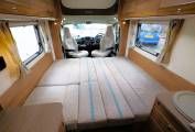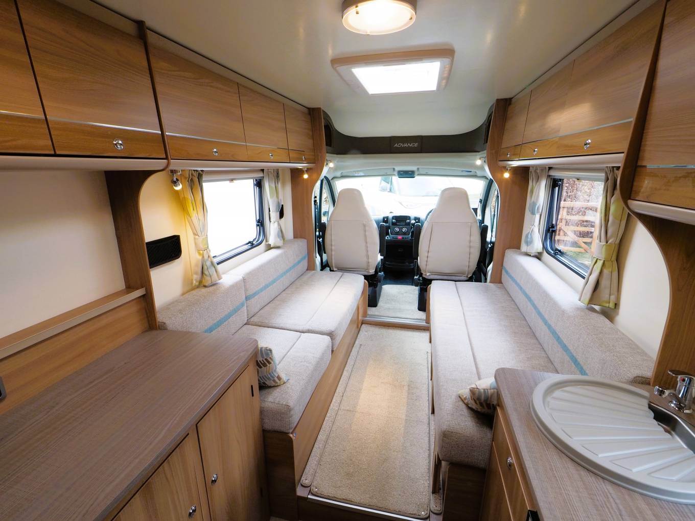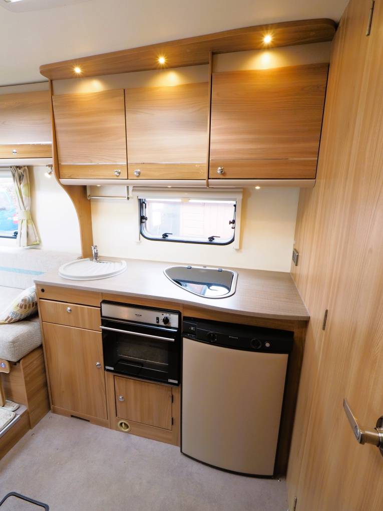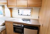 The comfortable lounge has two long side sofas and the front driver and passenger seats swivel to provide additional seating options. Drop in the occassional table for a relaxing place to dine and entertain and at night the sofas can be used as two separate single beds or pull out to create a huge double sleeping space. Plenty of storage in the overhead lockers to both sides and the nearside sofa has storage under with external access via a locker door. The well equipped kitchen comes with a 3 burner gas hob, combi oven and grill, microwave, sink with mixer tap and an under counter 3-way fridge with freezer box. Storage to both sides with cupboard and drawer space and an additional work surface gives a further prep area and a place to site a TV. To the rear is a good sized private washroom with flushing cassette toilet, sink with vanity mirror, separate shower cubicle and wardrobe with hanging rail.