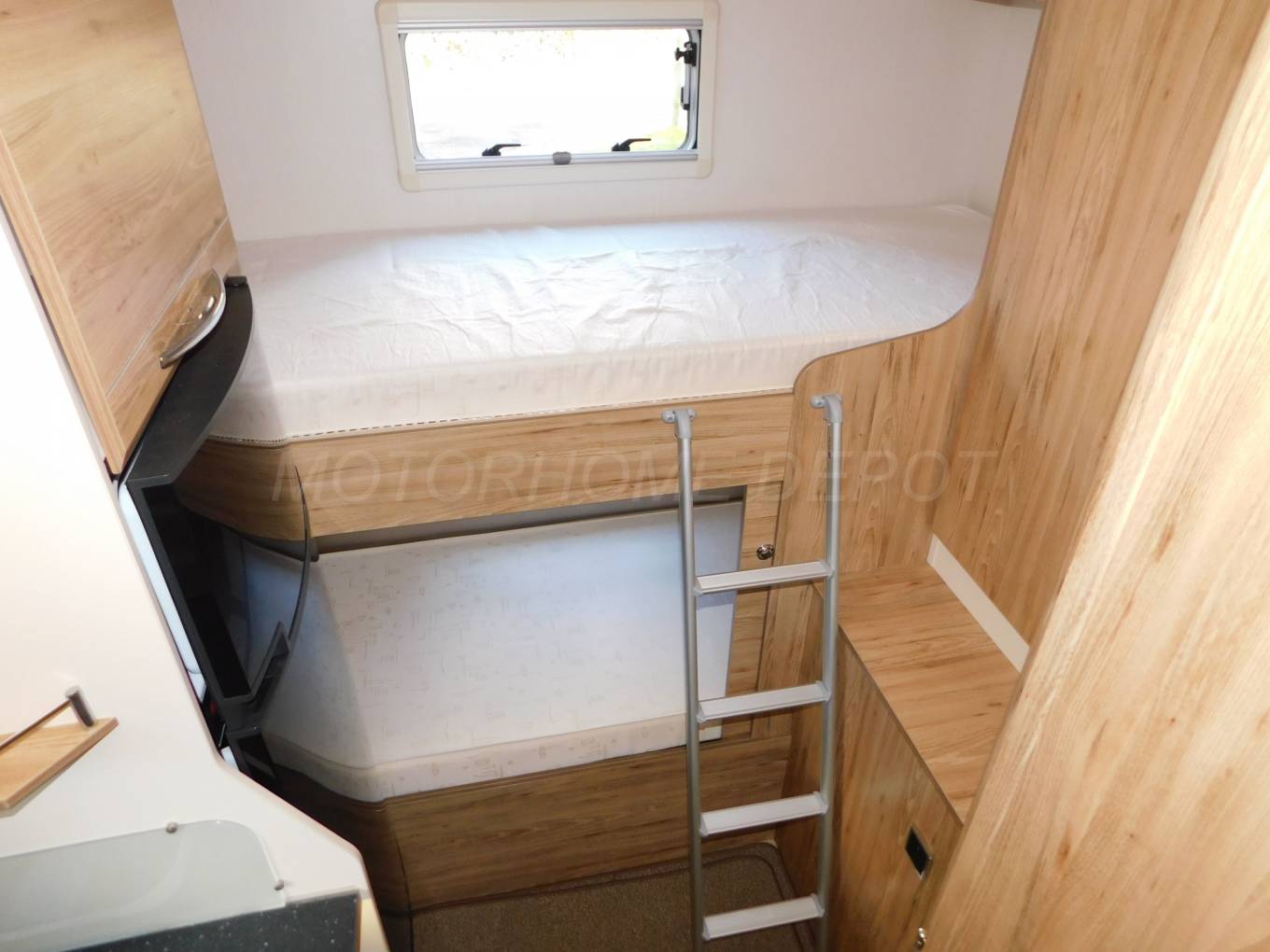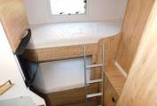 - At the rear you have two fixed bunk beds, top is accessed by an aluminium ladder & also has child safety net. Top & bottom bunks have windows & lighting.