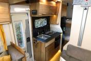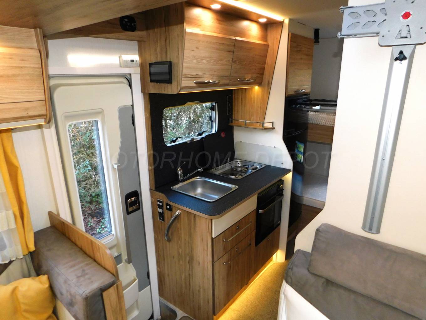 - The kitchen: Stainless steel sink, chrome mixer tap, stainless hob with 2 gas burners & black glass lid, Thetford Duplex gas grill & oven. Dometic full sized fridge / separate freezer box, (240v, 12v, Gas). Cupboard above fridge could house a microwave. USB & 240v sockets, upper lockers & lower drawers to store holiday provisions.