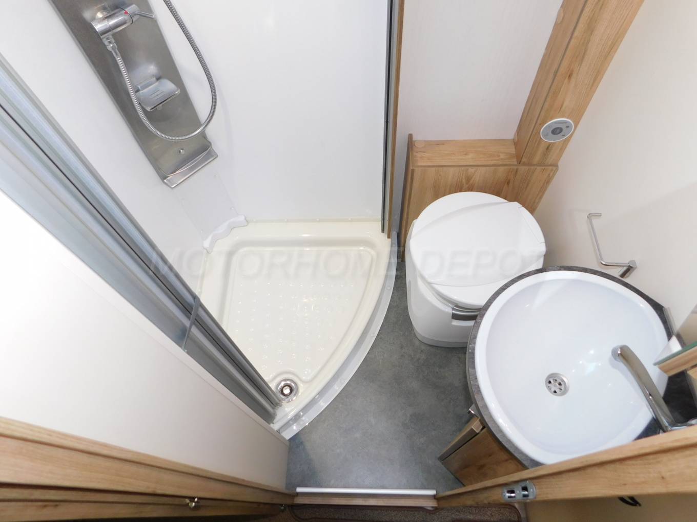 - The Washroom: Separate shower cubicle with folding perspex doors, rising rail & shower handset. Built-in washbasin, mixer tap, cupboard below, mirror & cabinet above, Dometic cassette swivelling toilet with electric flush.