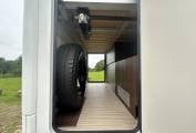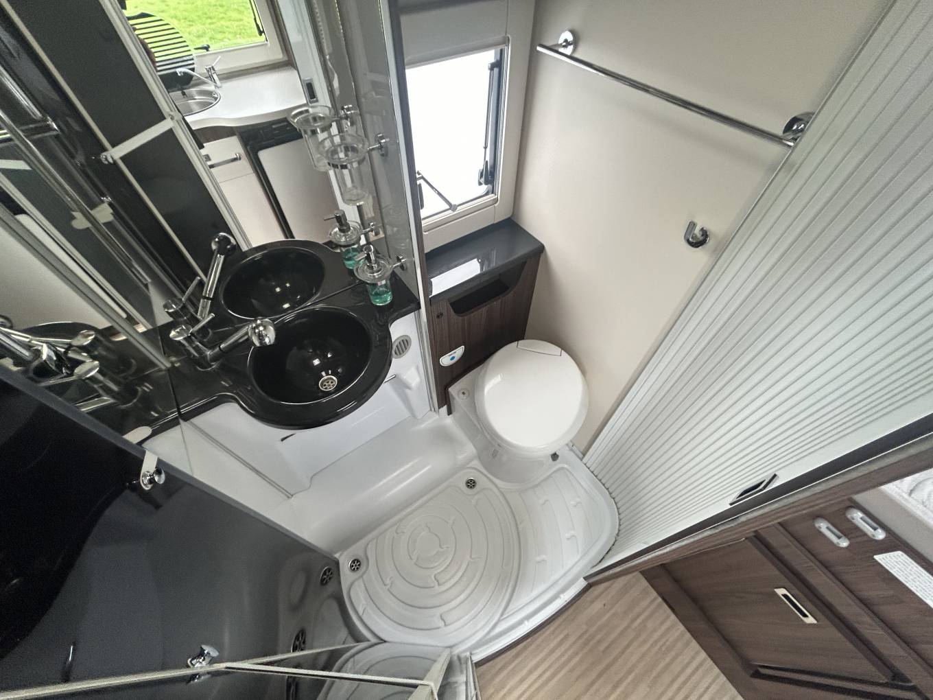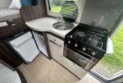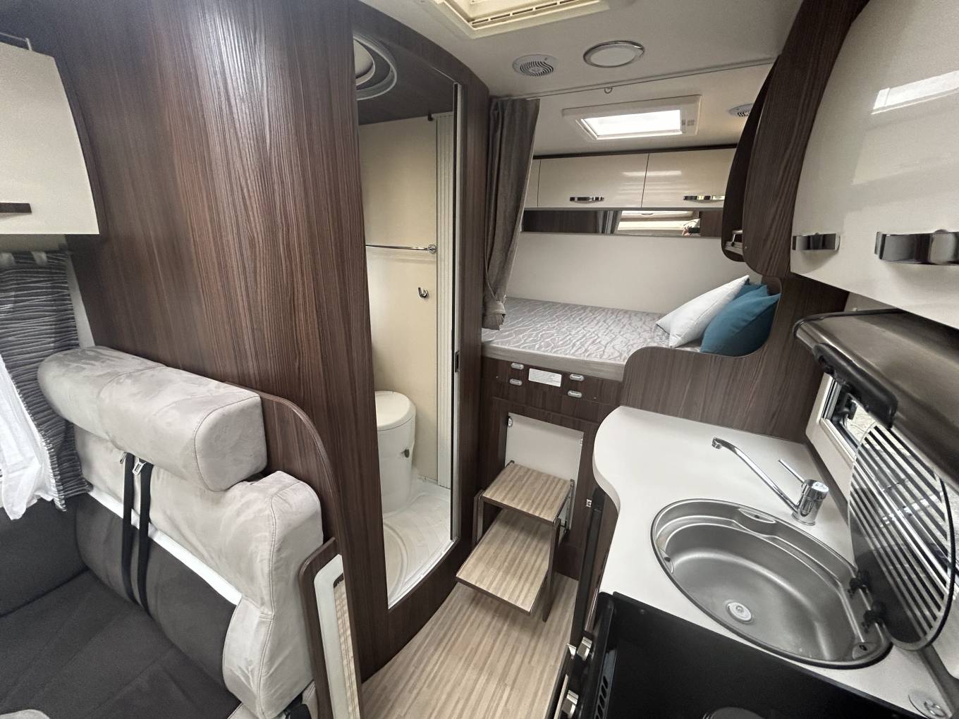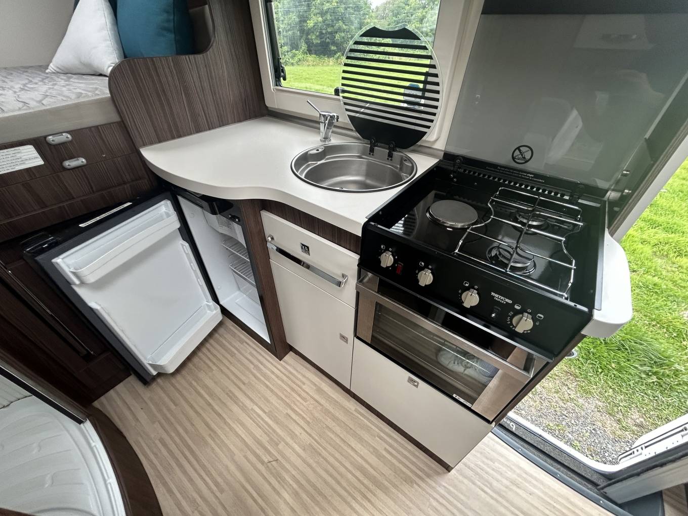 Layout - The end bedroom space boasts the fixed double transverse bed with surrounding storage units that sit above the large garage space and you have nicely stored away stairs to help you on to the bed as well as a large storing internal space behind the fold away stairs. The washroom is next and is a nice compact one with everything you need to refresh and recharge after a day of adventure, you have the shower cubicle with the toilet, washbasin and vanity mirror. Across from the bathroom and next to the habitation door is the kitchen area and here you have everything you need to cook up a hearty meal for any occasion including, modern 3 way fridge with freezer space, 2x gas hobs, 1x electric plate, oven and grill combi, mixer tap and sink unit.