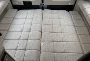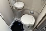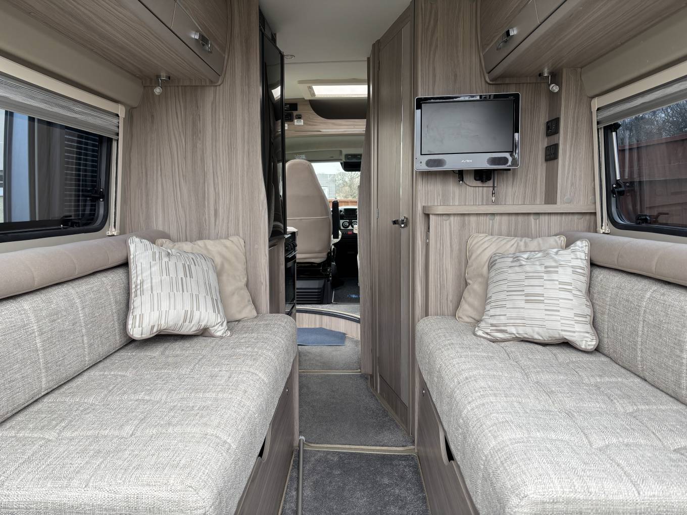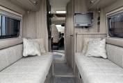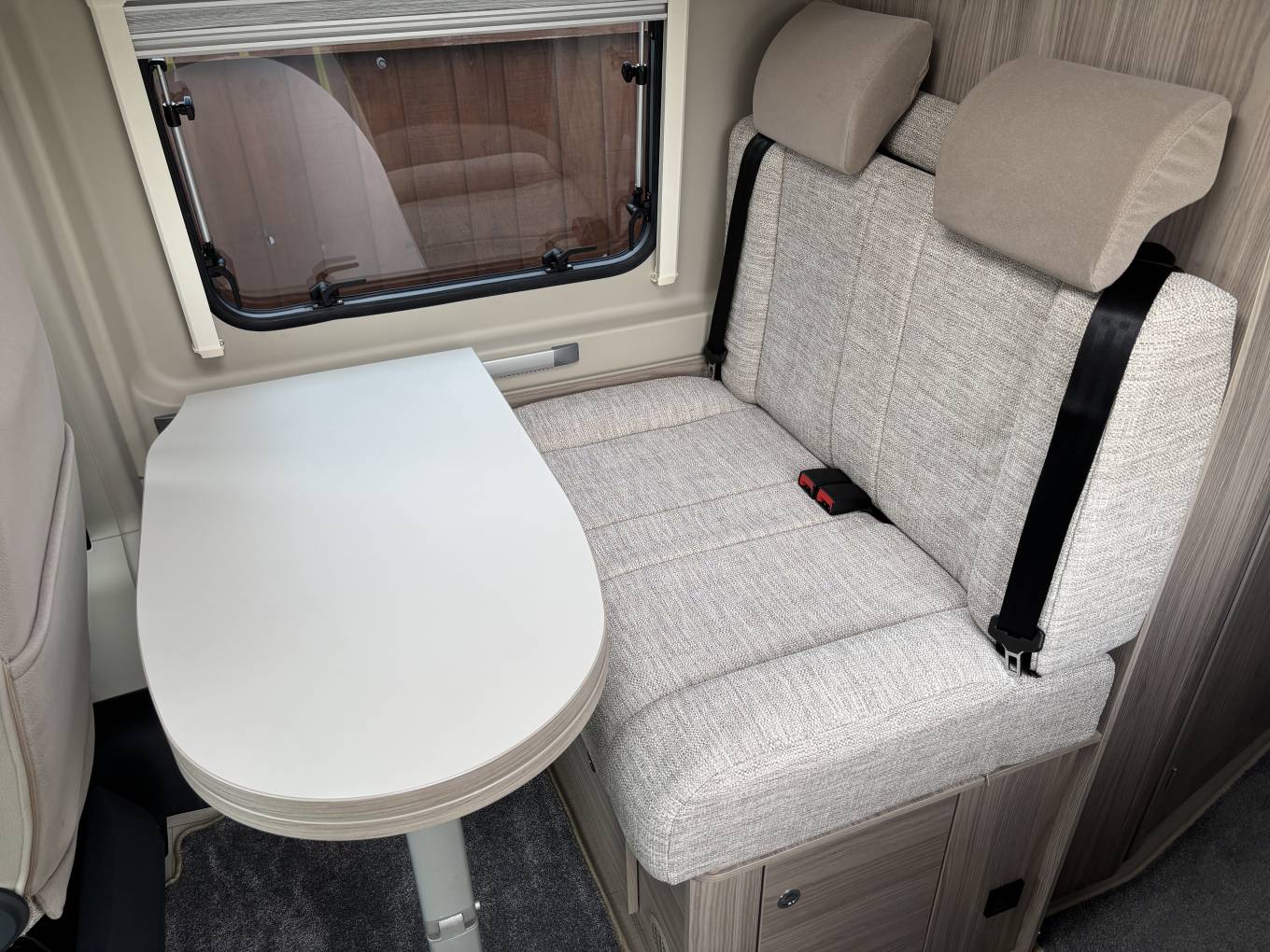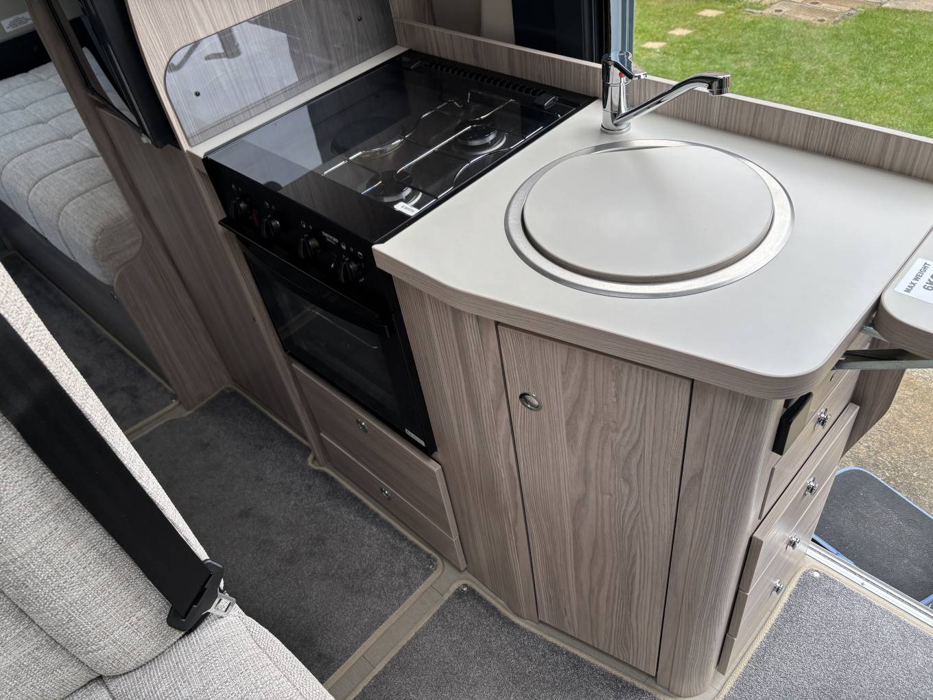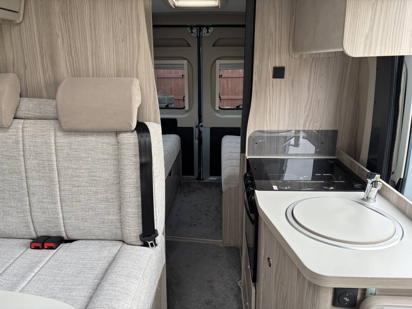 The central kitchen is well-equipped with a sink, three-burner hob, grill, oven, and a good-sized fridge freezer, giving you everything you need to prepare meals on the go. Opposite the kitchen is a modern washroom complete with a sink, toilet, and shower, ensuring convenience and comfort throughout your travels.