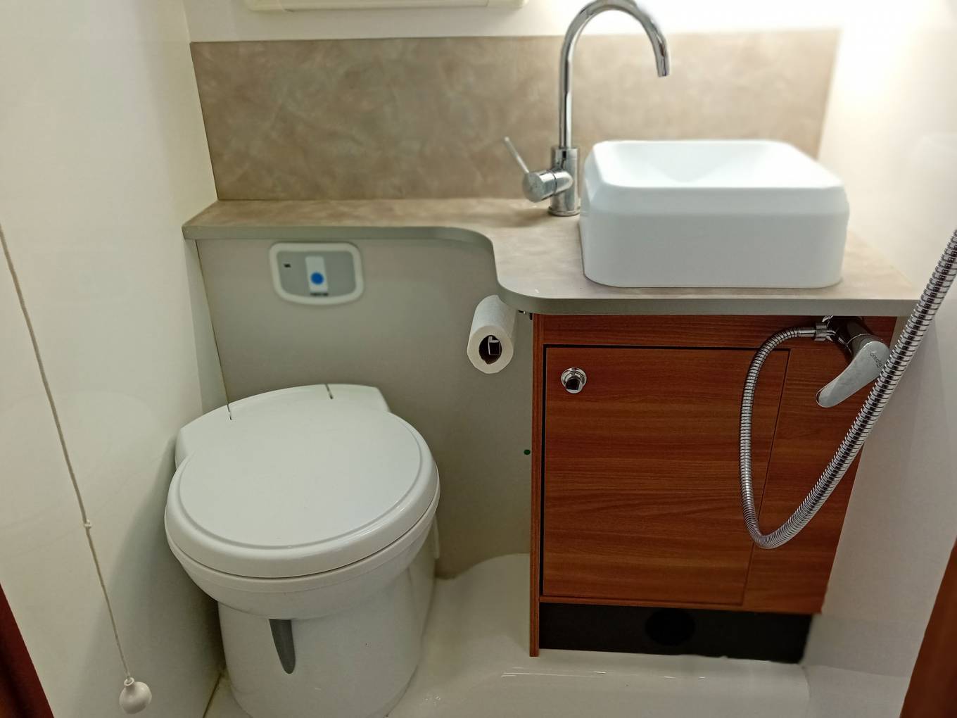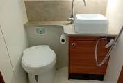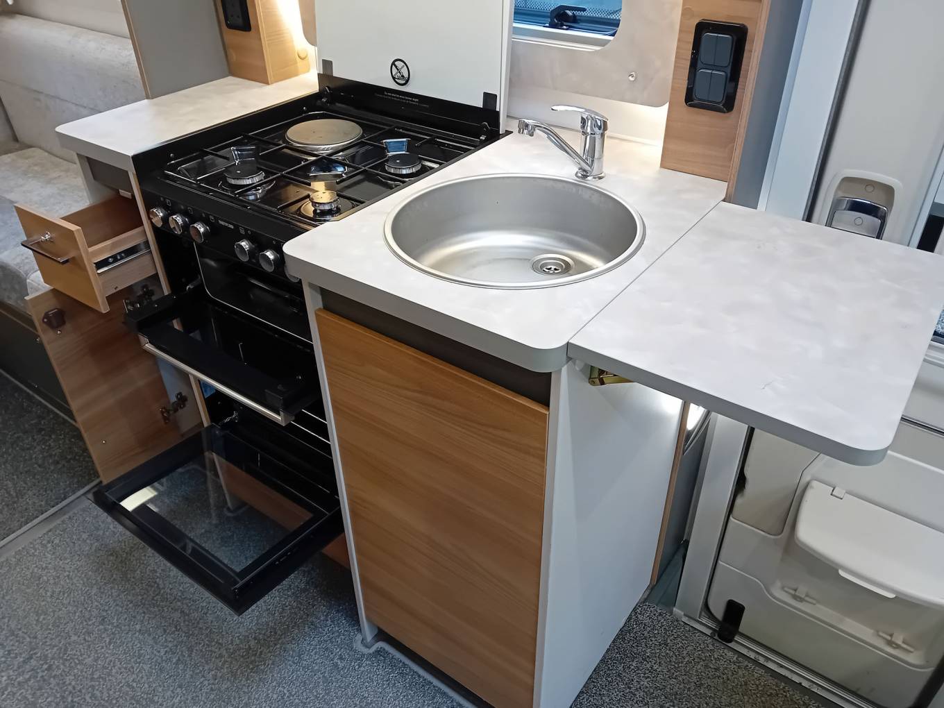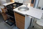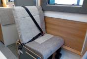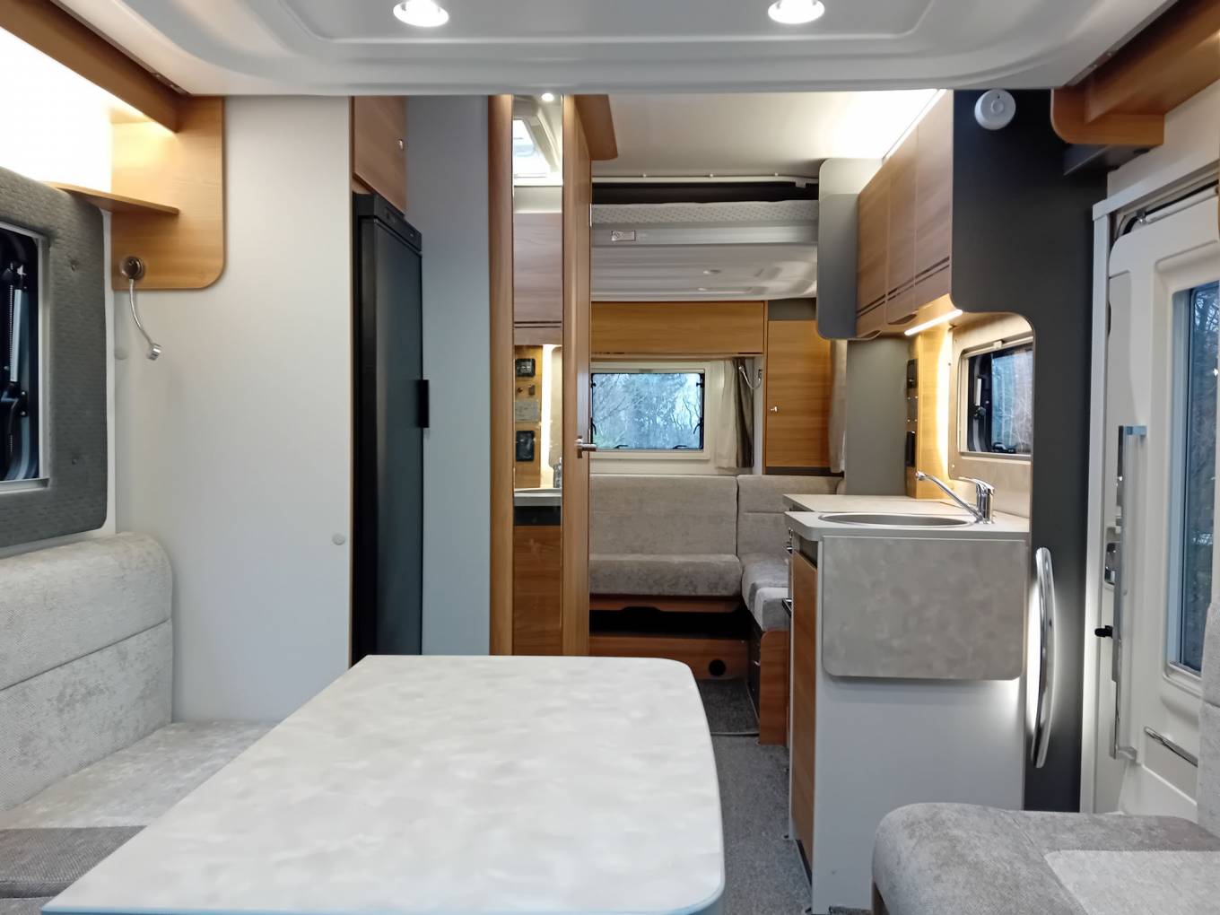 Essentially the layout comprises of a forward dinette with twin side settees and swivel cab seats, around a multiposition table with electric height control, a centre kitchen and washroom then a rear U lounge. Each dinette has an electrically lowering double bed above, coming down to approximately 1 metre off the floor. In the forward dinette are two factory fitted pop up travelling seats with 3 point belts, making 4 travelling seats in total. The washroom and kitchen are both well equipped and there is a powerful dual fuel heating and hot water system.