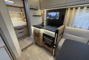 A mid ship kitchen is well equipped and includes a large 3 way fridge freezer.