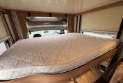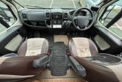 Mid habitation is the Lounge area that enables you to travel an extra 2 guests using the 3-point seatbelts on the forward-facing bench and this area can easily make a bed if needed by adjusting the dining table. Above the lounge area is the large double electronic drop-down bed that comes down low enough to enable you to have a coffee in bed in the morning or a glass of wine in bed in the evening! Both front seats swivel into the lounge area to enable you to sit 4 comfortably around the table.