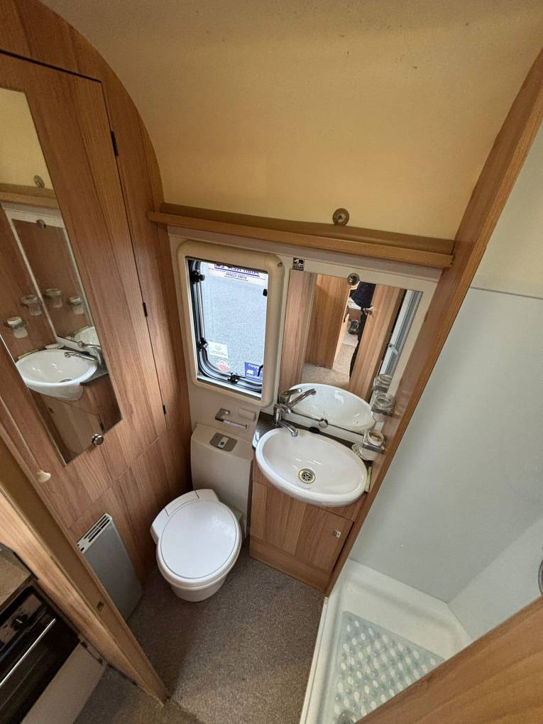 as well as toilette cassette, wash basin, vanity mirror and large storage cupboard