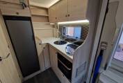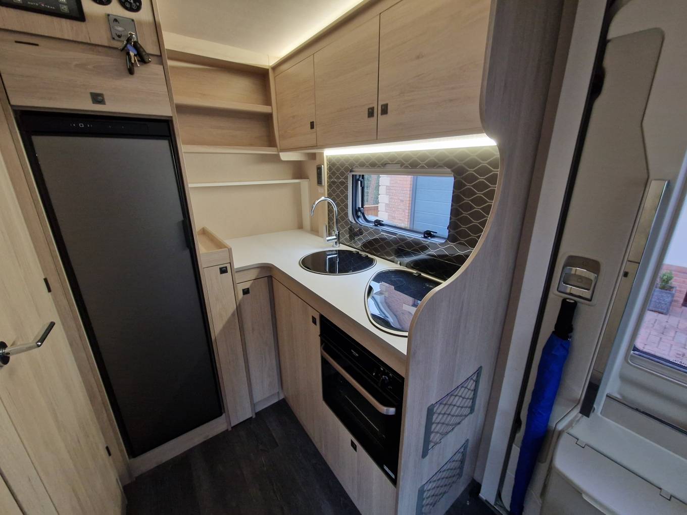 At the rear of the motorhome, you will find the fully functional kitchen area with a 3-burner gas hob, sink with hot & cold mixer tap, combined oven and grill and large slimline fridge with freezer compartment. There is also plenty of storage both at floor and eye level.