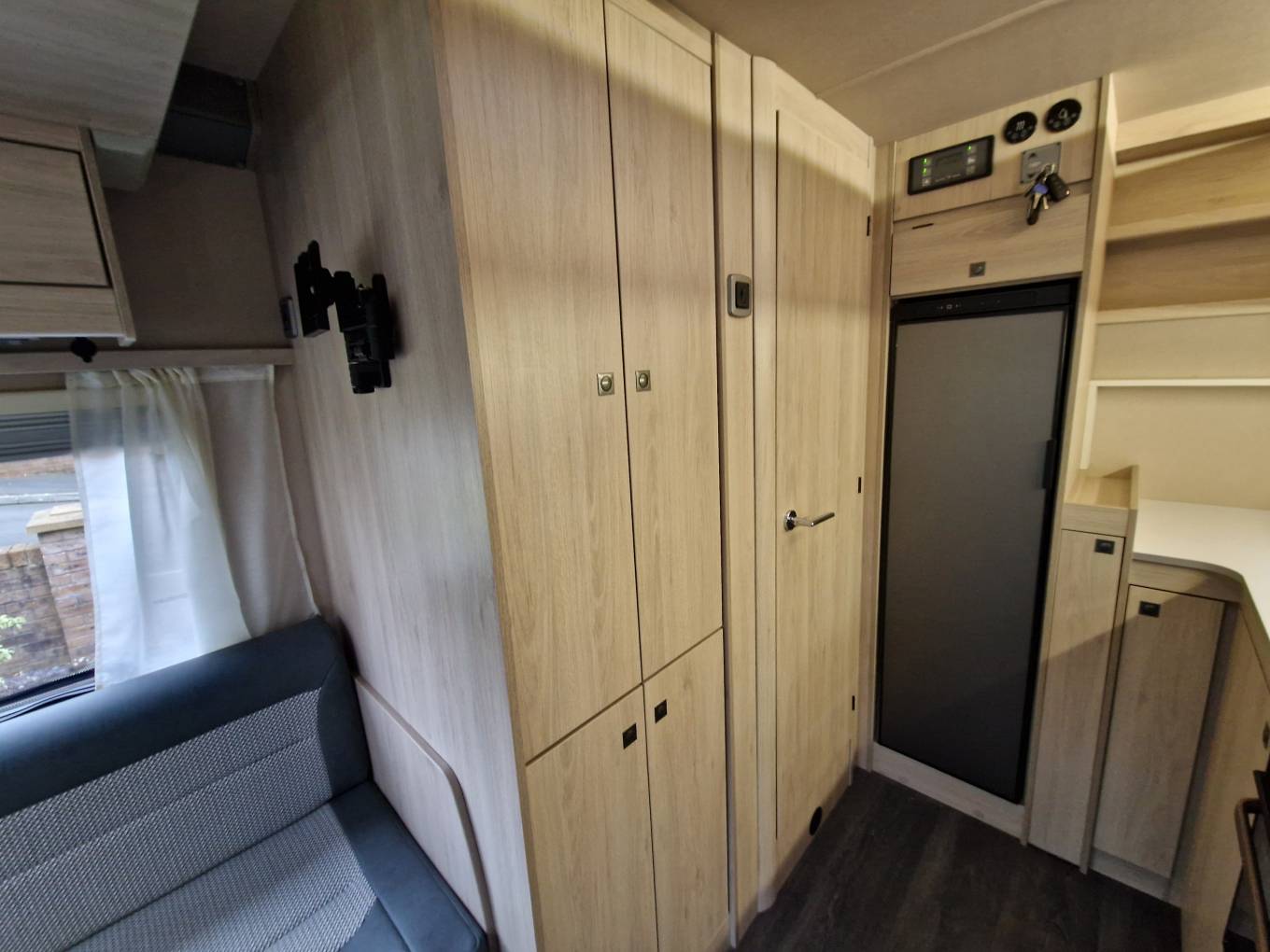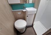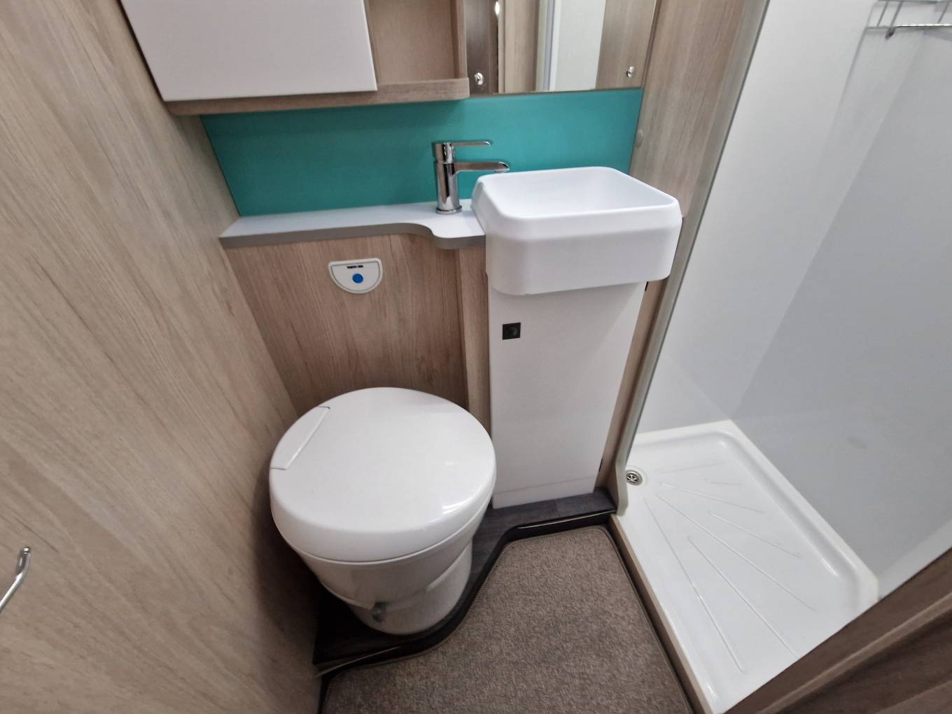 Facing the kitchen is the washroom with a separate shower cubicle, vanity handwash basin, Thetford cassette toilet and plentiful storage.