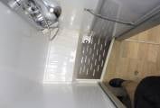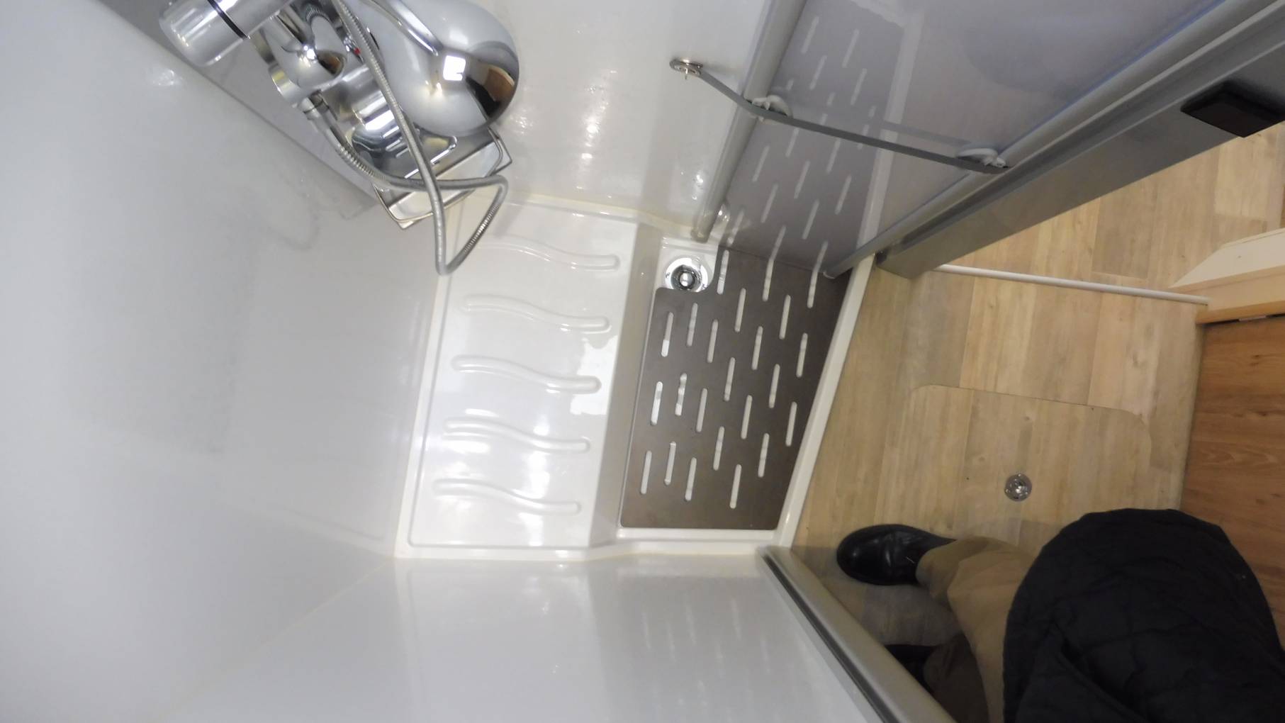 Moving rearwards the washroom is split across both sides of the motorhome. On the nearside there is a large separate shower with Perspex screen doors and on the offside there is a Thetford cassette toilet with electric flush, a stylish bathroom cabinet for your toiletries, a mirror and a wash basin with a mixer tap. This area can be enclosed with wooden doors for privacy.