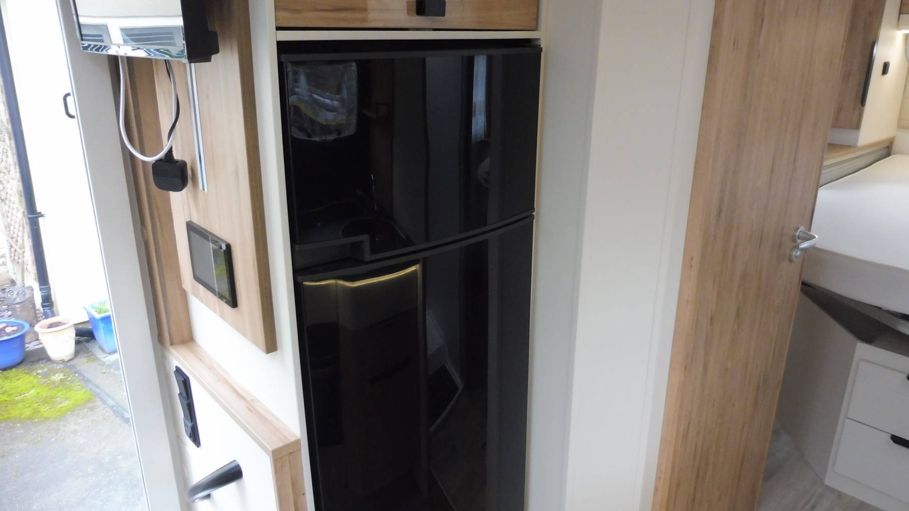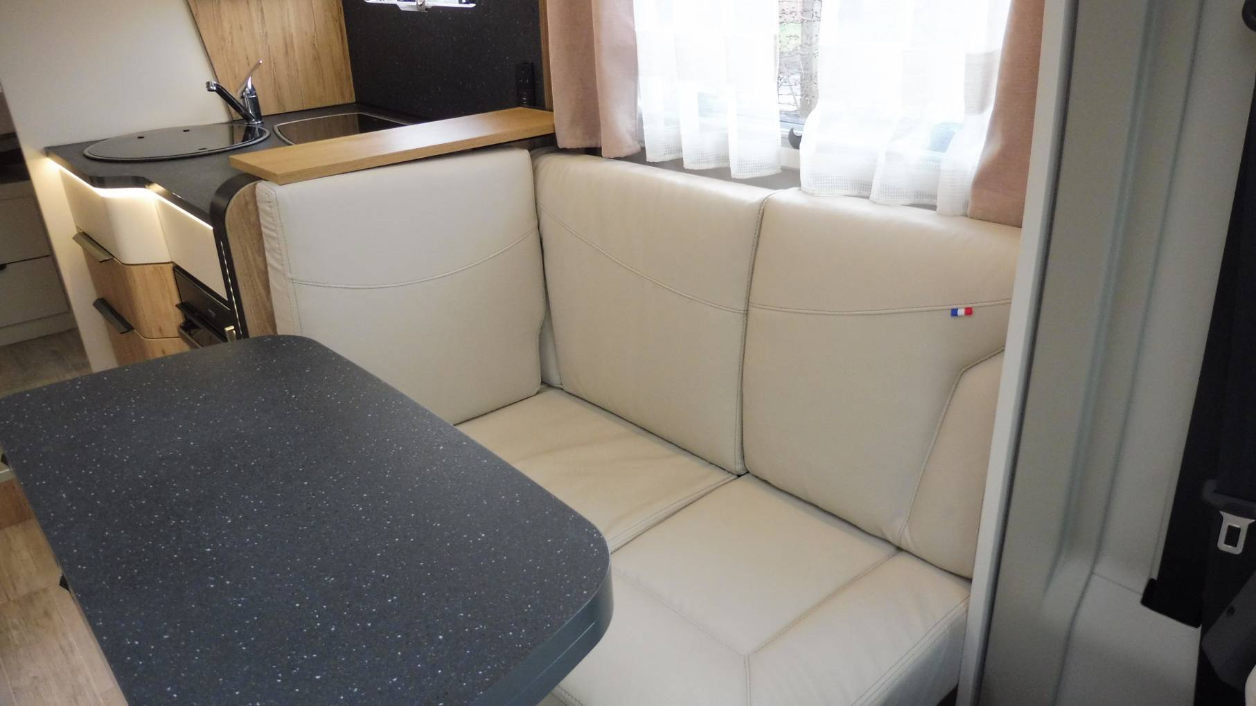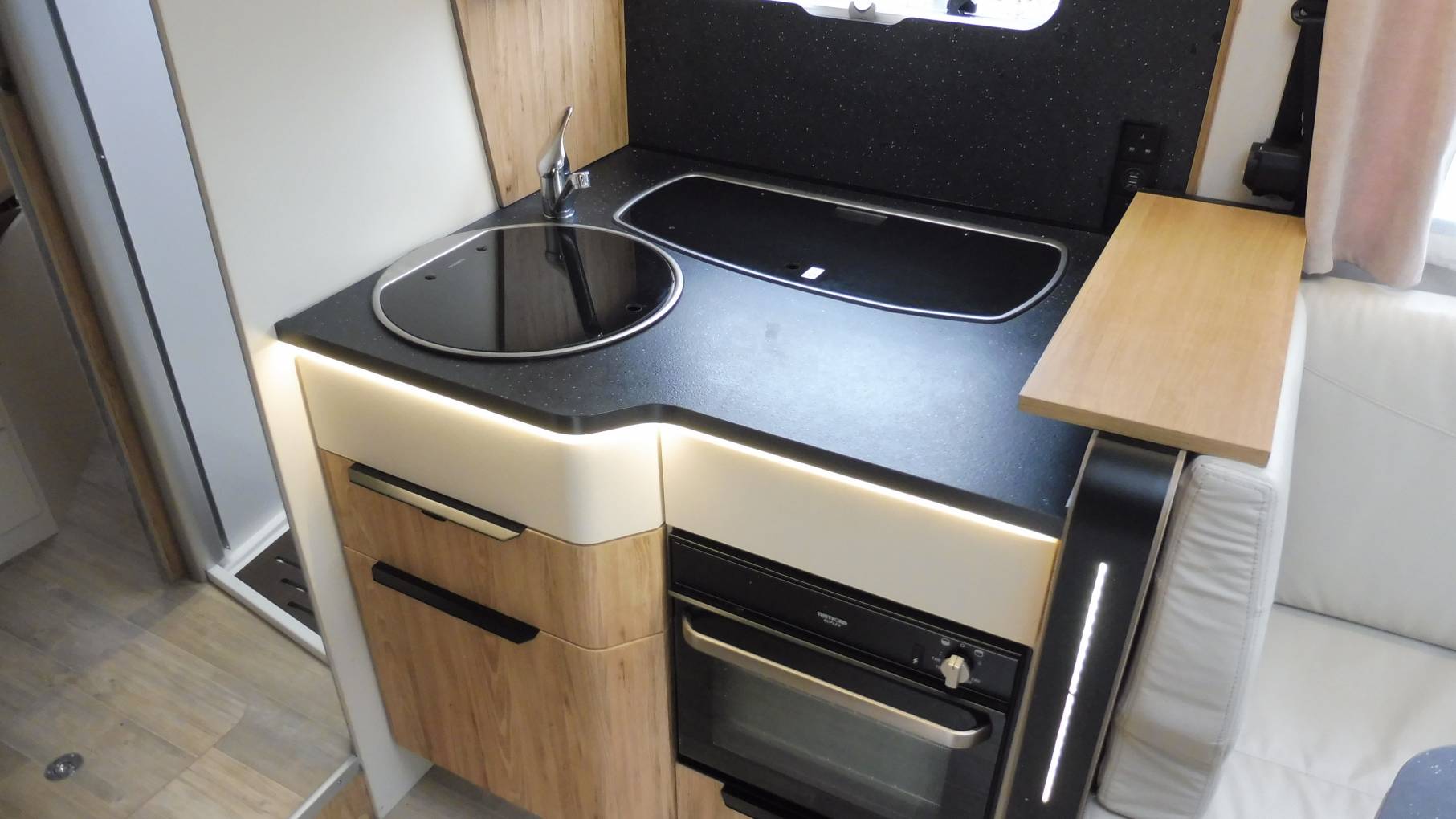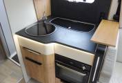 The mid-kitchen is impressively equipped so you have all the facilities you need to rustle up a snack or prepare the evening meal; there is a 3-burner hob, combination oven, large fridge with separate freezer compartment, sink and plenty of storage for your culinary requirements.