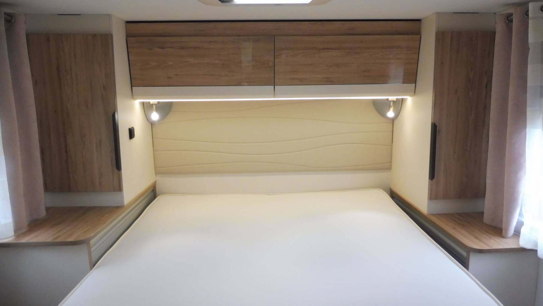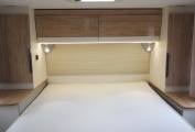At the rear of the motorhome is a fabulous bedroom with the hugely desirable island bed. Unlike many, there is a good walk-space on either side to get in and out of bed. Hanging wardrobes flank the bed and there are drawers beneath.