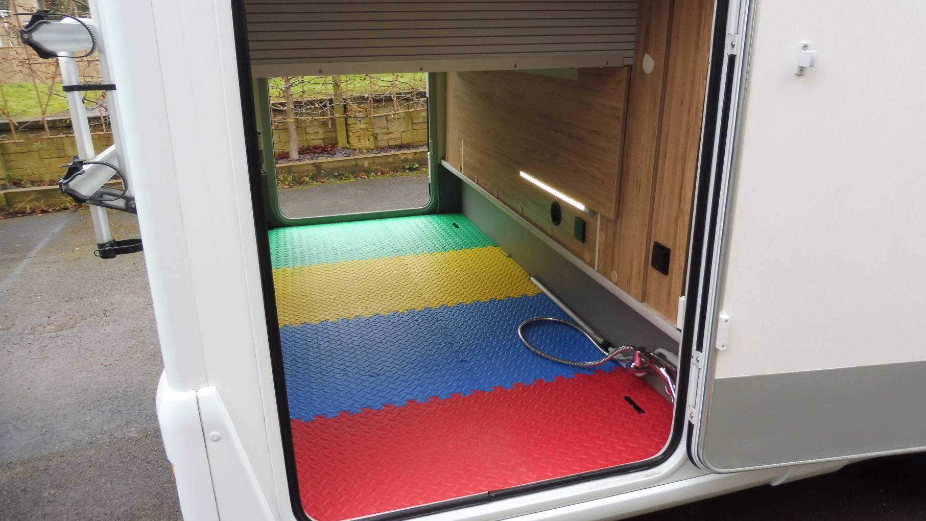 Storage is never going to be a problem with this van – as we move outside the stand-out feature is the huge garage, which can be made even bigger by raising the electronic bed. There is also a skirt locker for dirty kit.
