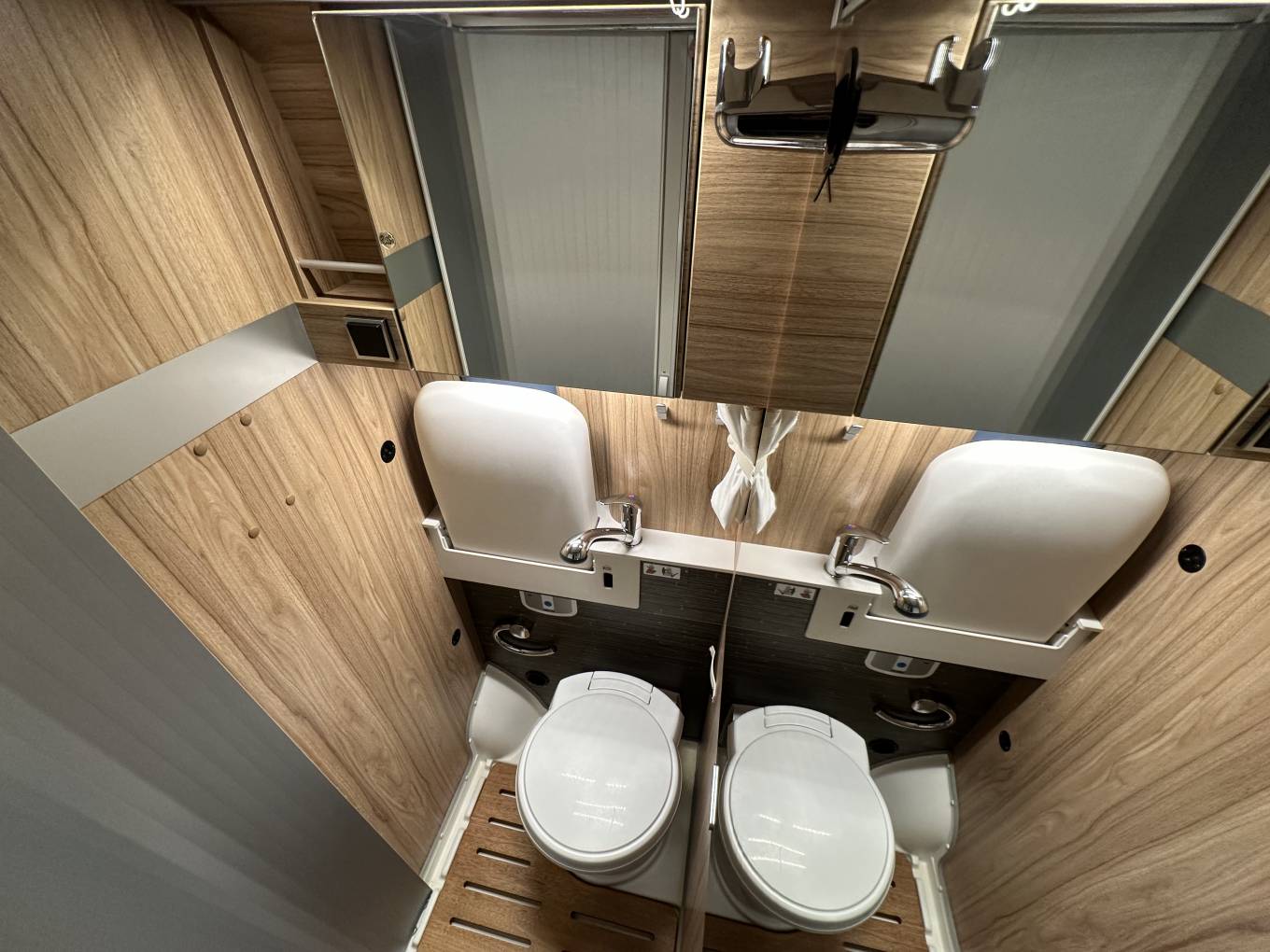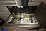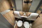 Moving through we come to the kitchen area which has a tall fridge freezer, 2 ring gas hob and sink with mixer tap, again there no shortage of storage in and around this area. Adjacent to the kitchen is the washroom which includes a Thetford cassette toilet, sink with hot and cold taps with shower cubical.