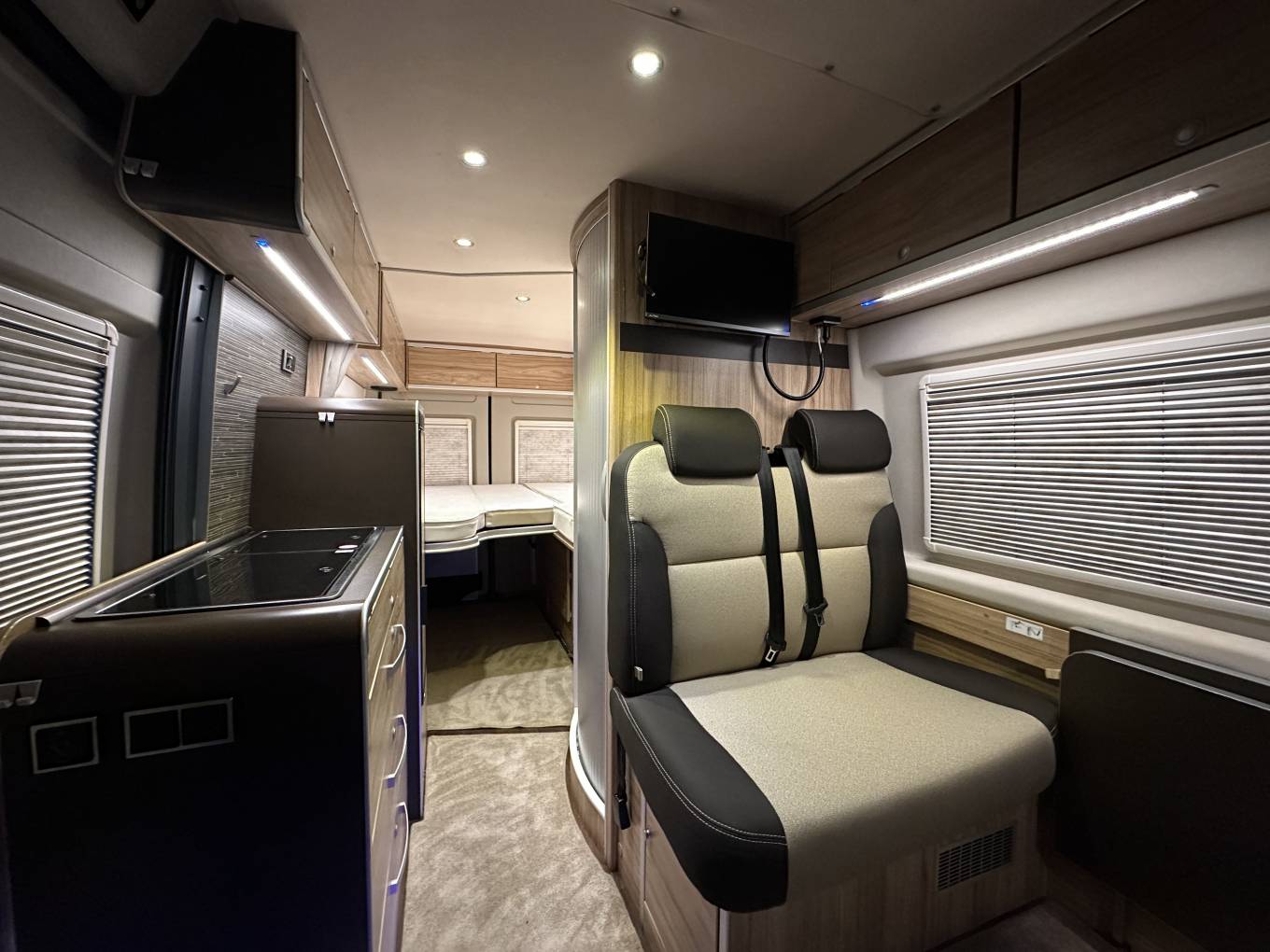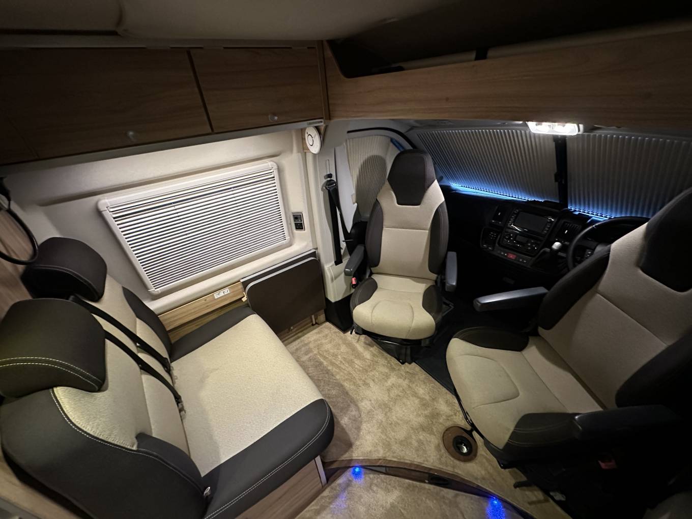 The dinette is incredibly spacious and is flooded with light making it a fabulous spot to relax and unwind in. Not only do both the passenger and drivers seat swivel round, you also have the rear two traveling seats that form part of a lovely seating area and there is a dining table that's lift and locks into position.
