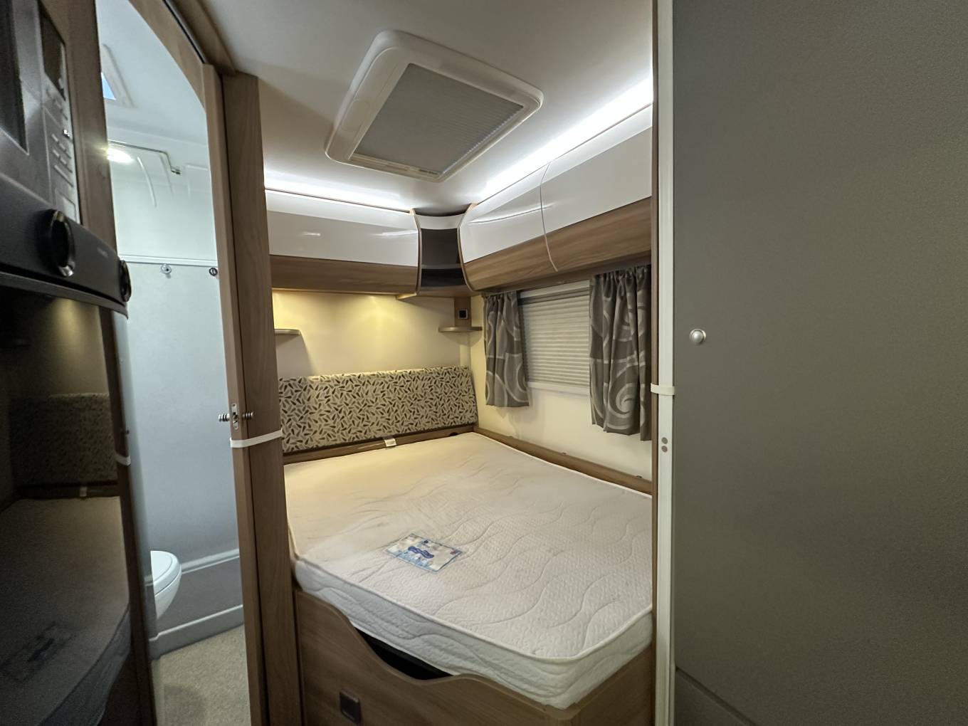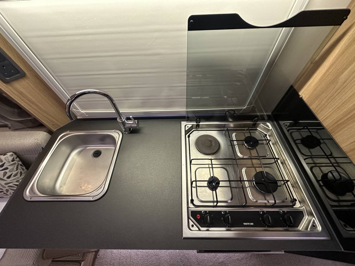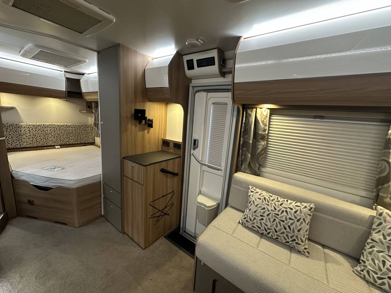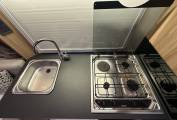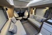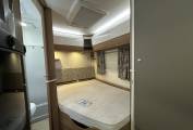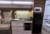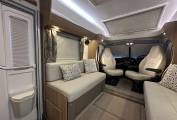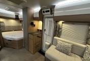 The motorhome is light and airy with panoramic Heki roof lights and the habitation area feels very spacious. There are aero style lockers in brilliant white throughout the motorhome, which give a contemporary look whilst providing a practical storage solution. The large continental style kitchen area has a combi oven/grill and gas hob with 3 gas rings and an electric hot plate, a microwave, sink and 3-Way fridge/freezer. The wash room, located adjacent to the French bed consists of a wash basin, separate shower and electric flush cassette toilet.