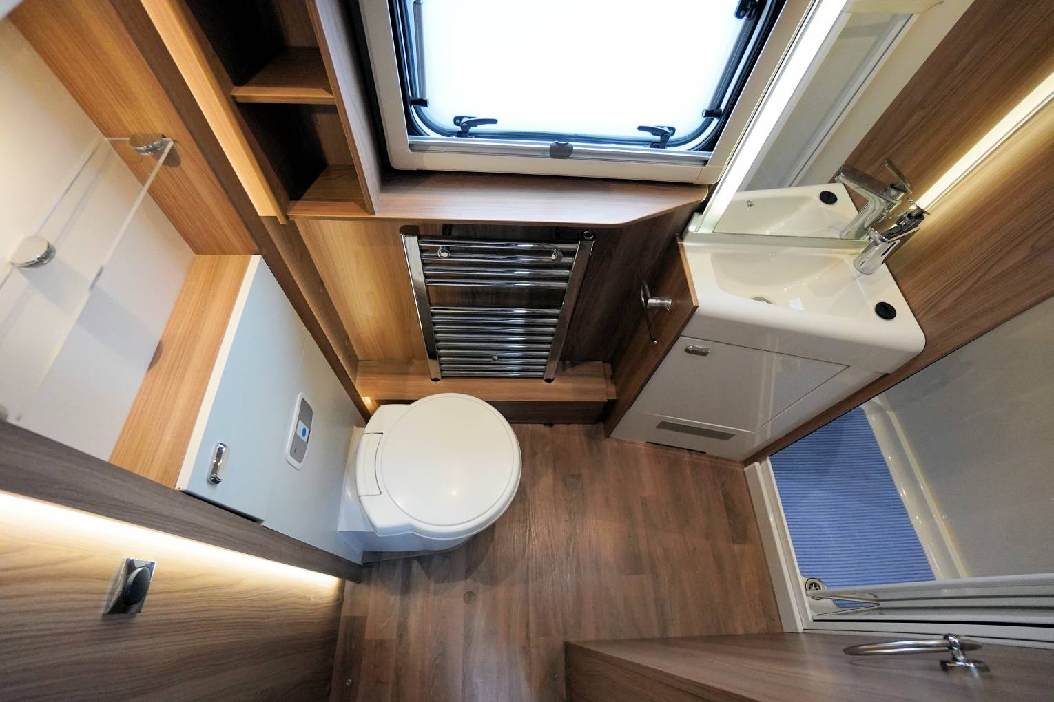 • Washroom with Thetford cassette toilet, vanity unit and full-size shower opposite