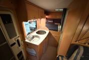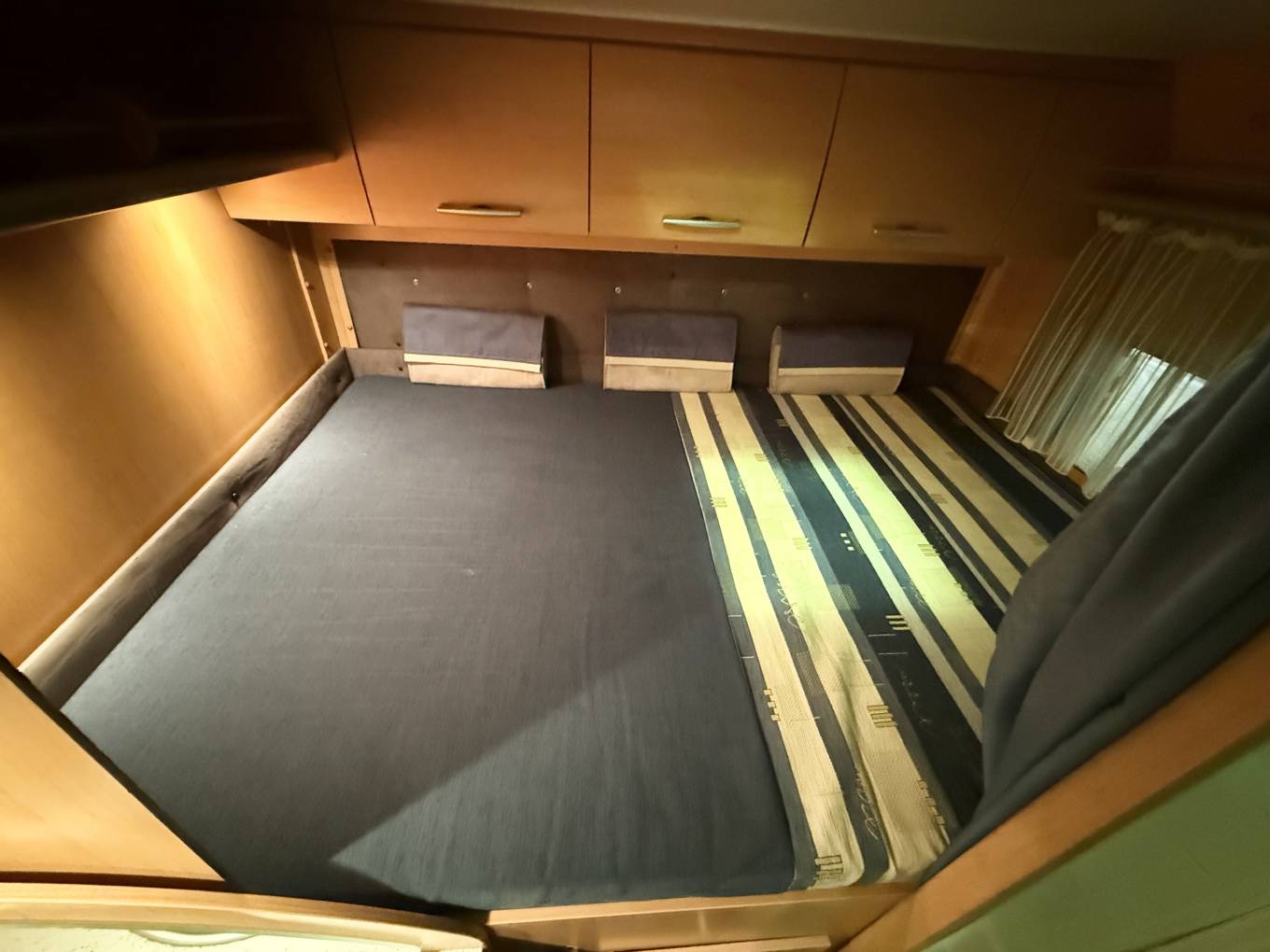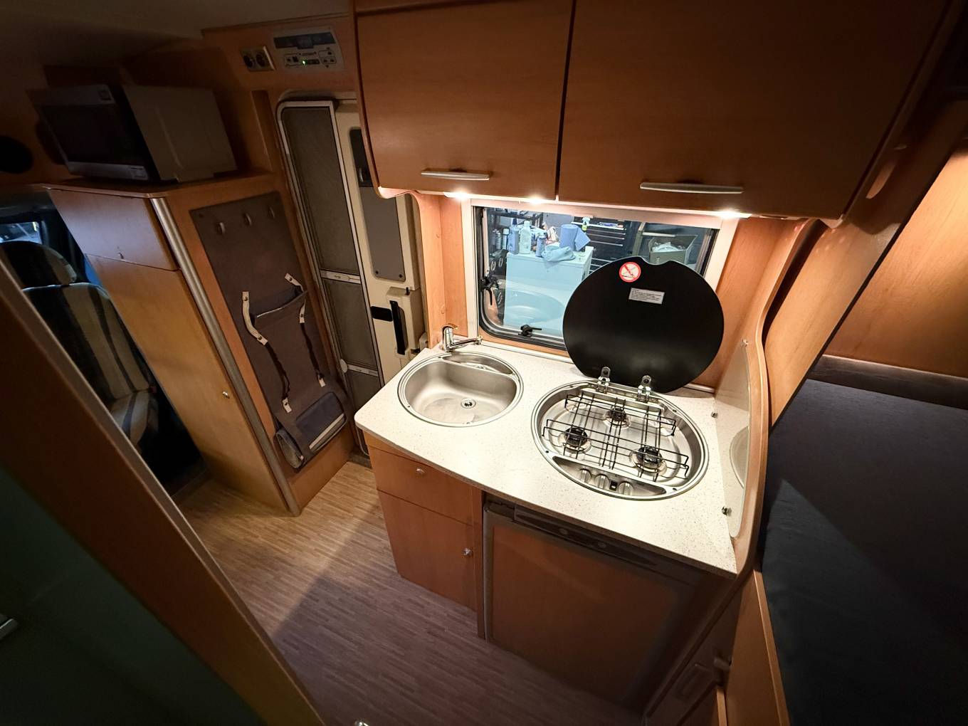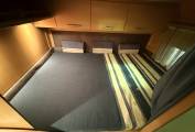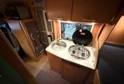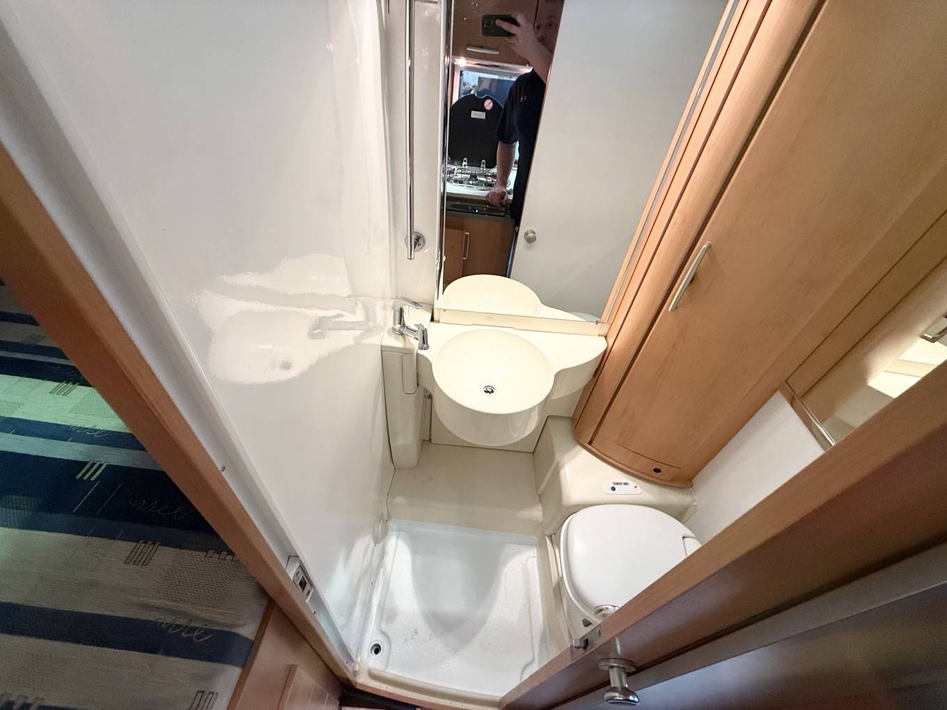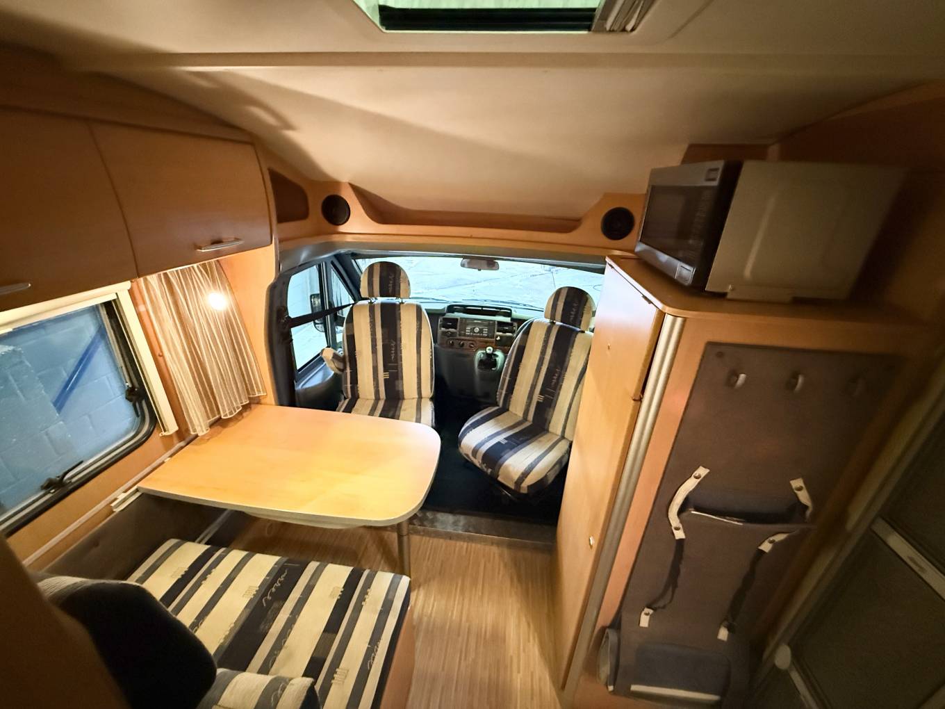 The interior consists of a transverse fixed double bed at the rear, kitchen area with 3 burner hob, sink with mixer tap and fridge with freezer compartment. The front lounge / dining area has two front facing seats complete with seat belts. The two cab seats swivel to allow four to sit at the dining table with an additional swing out section. The washroom consists of a Thetford cassette toilet, shower, sink, mirror and storage cupboard. The sink is swiveled above the cassette toilet area to allow the use of the shower. There is a Truma Blown air system fitted and a Truma water heater. Fly screens and blinds are fitted to all windows.