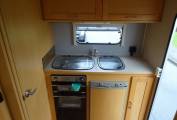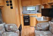 Both Cab seats swivel making up a comfortable lounge area. There is a large fold away table for dining. The parallel sofas pull together and the double bed can be easily set up. This popular layout has an end kitchen with gas hob, grill, oven, 3 way fridge and sink. There is also an end washroom with shower, bench toilet and drop down basin. There is an extra prep area, excellent storage throughout including a hanging wardrobe. Heating and hot water is Truma on gas and electric. Other features include a reversing camera, TV/DVD, and fresh and waste water tanks.