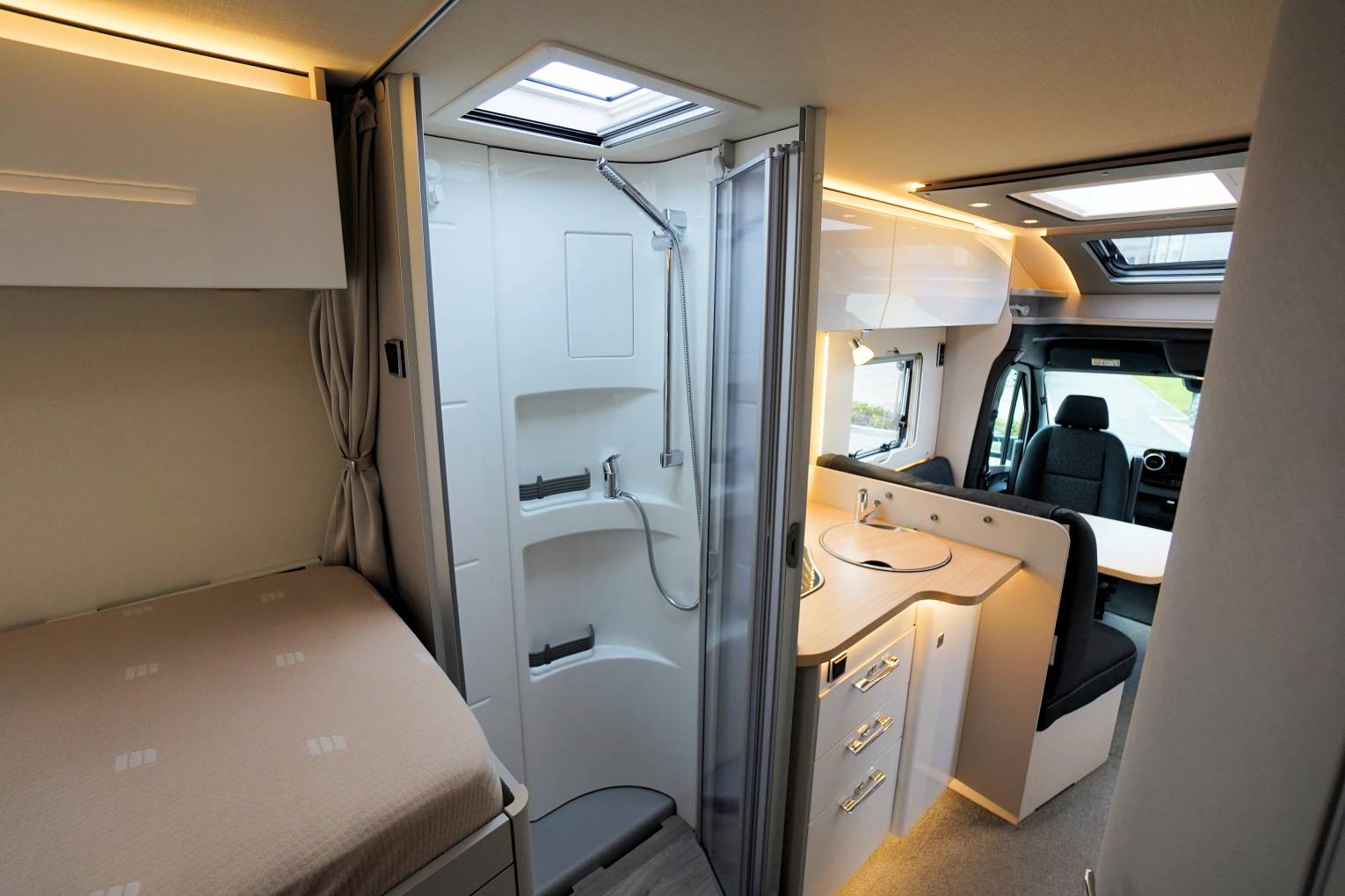 • Washroom with Thetford cassette toilet with electric flush, hand basin and vanity unit