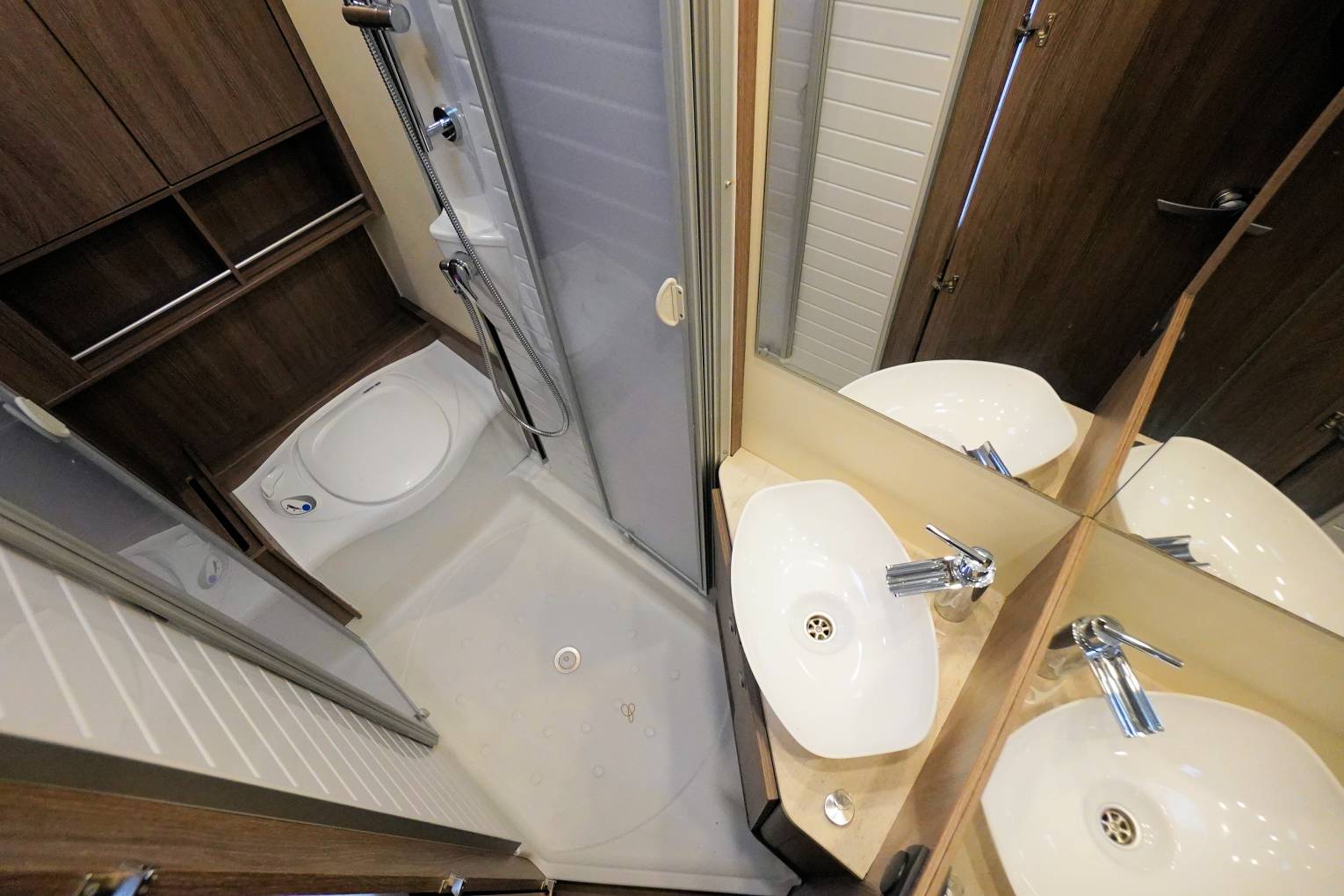 • Washroom with Thetford cassette toilet, vanity unit and shower with bi-fold doors