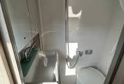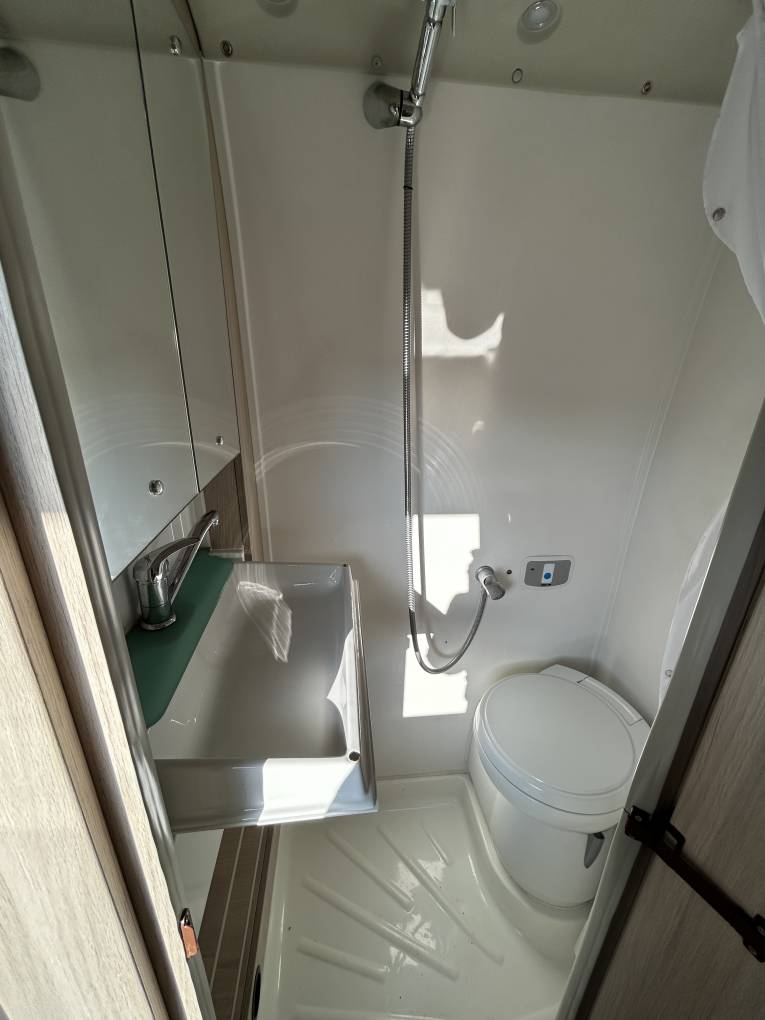 The washroom is on the opposite side to the kitchen and here you have a shower, a Thetford cassette toilet with electric flush, a foldaway wash basin with a mixer tap and a mirrored bathroom cabinet.