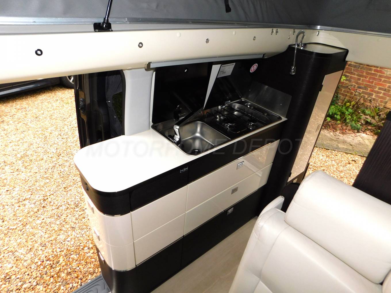 chrome tap, 2 gas burner hob, both with dark glass lids. A Vitrifrigo 12v fridge