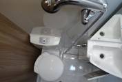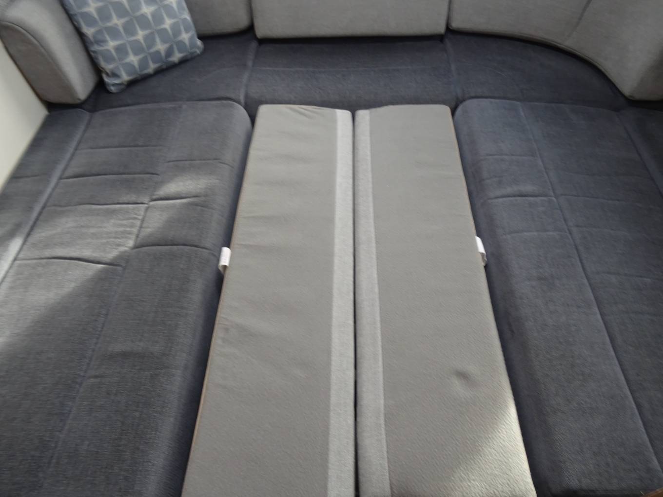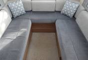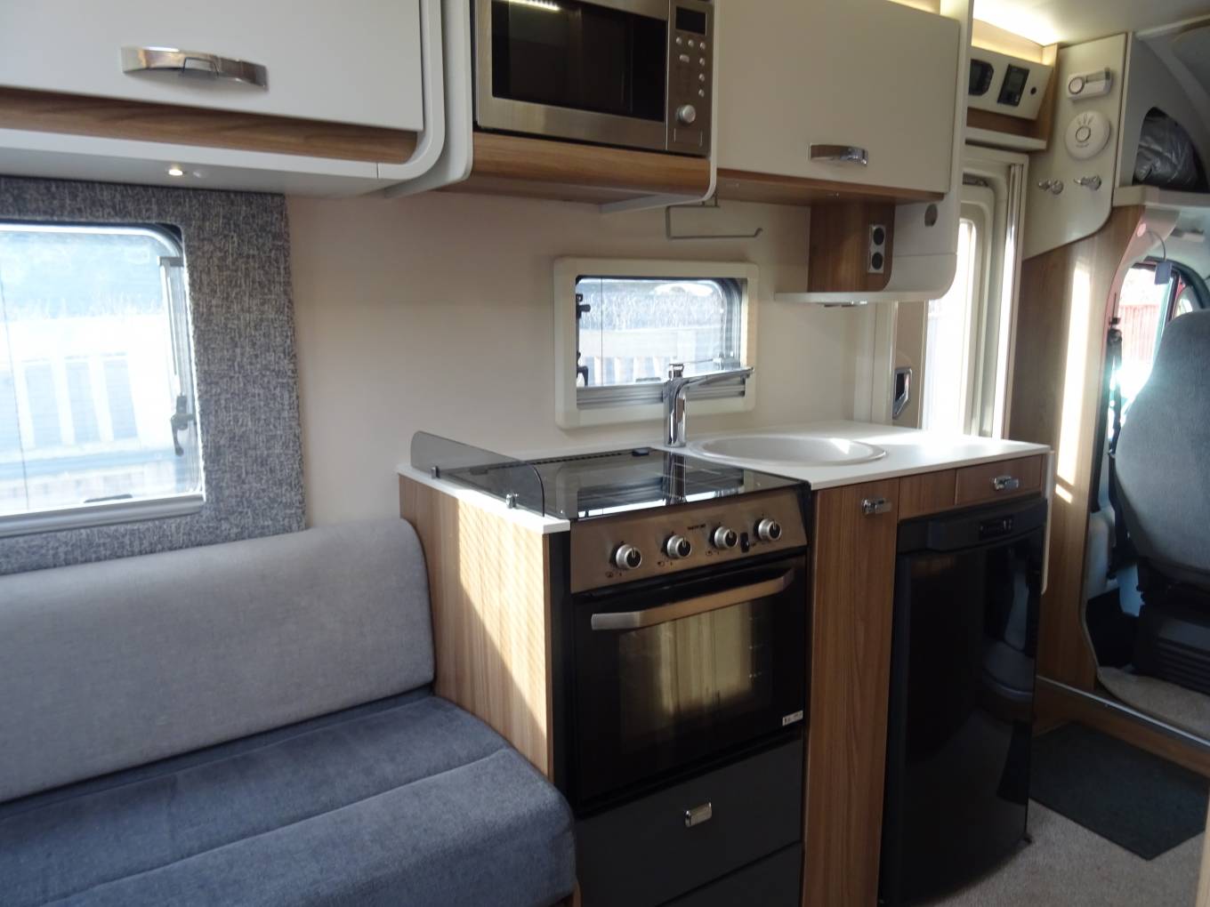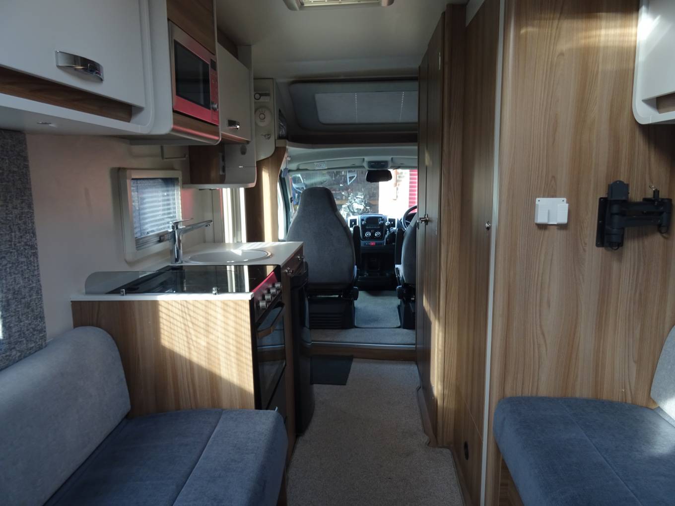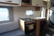 The rear U Shaped lounge can be used as 2 single beds or 1 large double. There is a folding table for dining. The mid ship kitchen area is well equipped with full cooker/grill and hob, 3 way fridge, sink and mixer tap, work top extension and a microwave. Opposite are the hanging wardrobe and washroom.