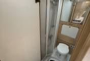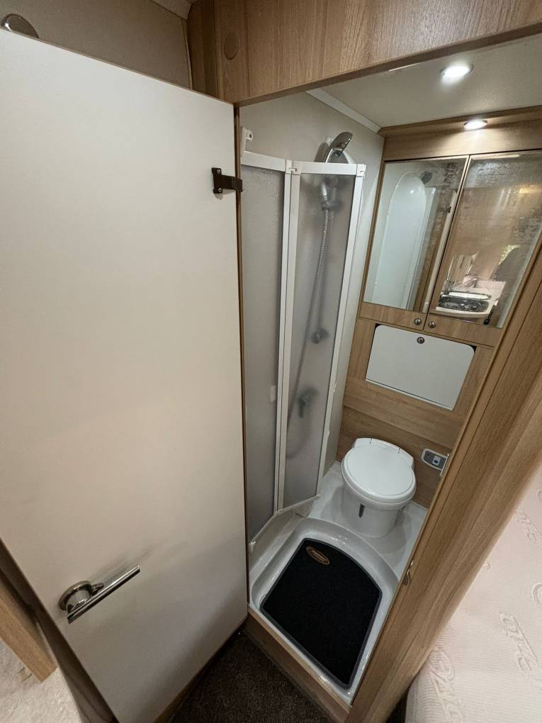 the bed. At the rear is also the washroom that comes with a shower, toilet cassette,
