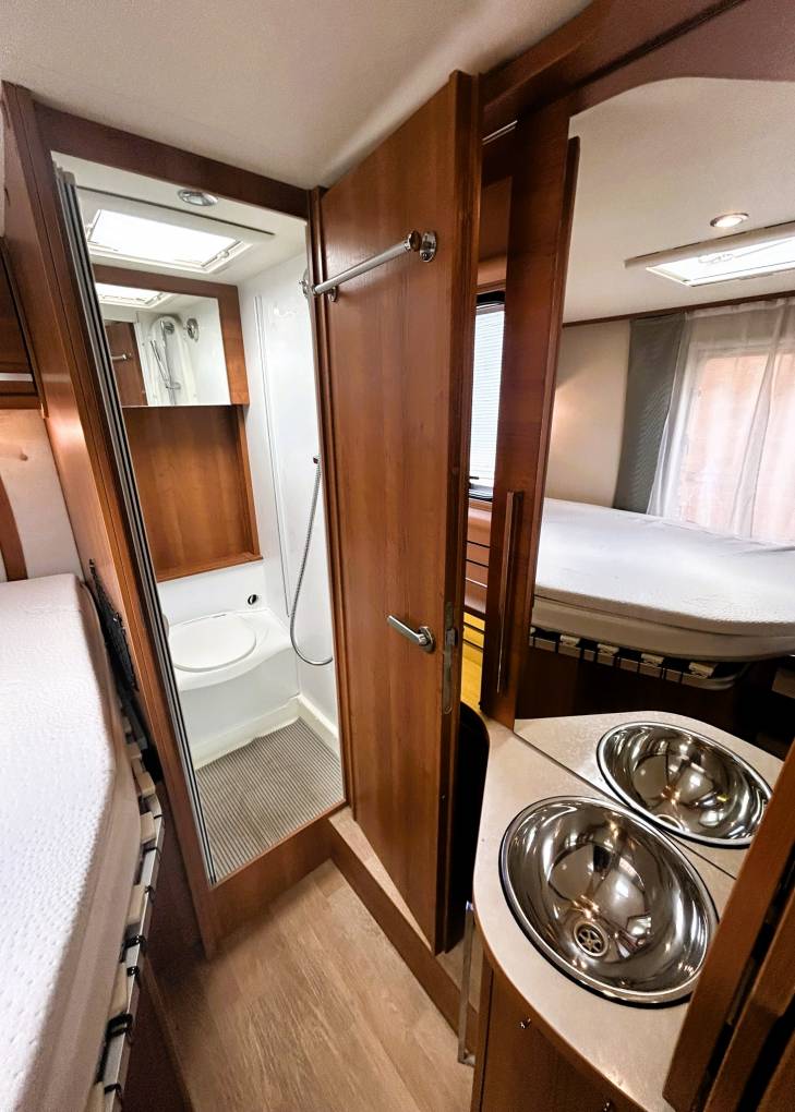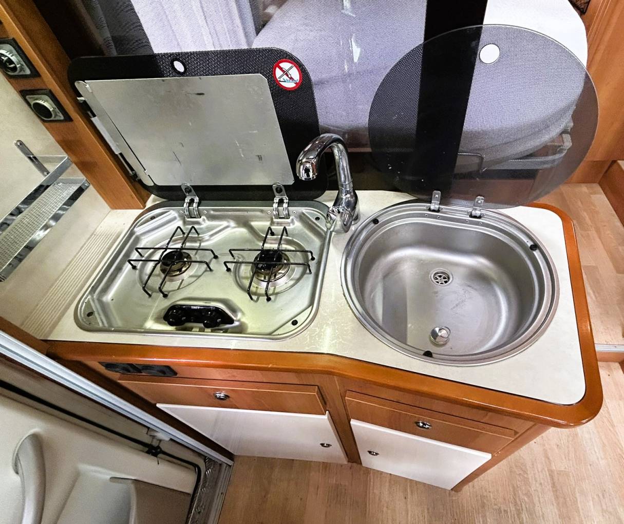 The kitchen is in the centre of the vehicle and comprises a two-burner