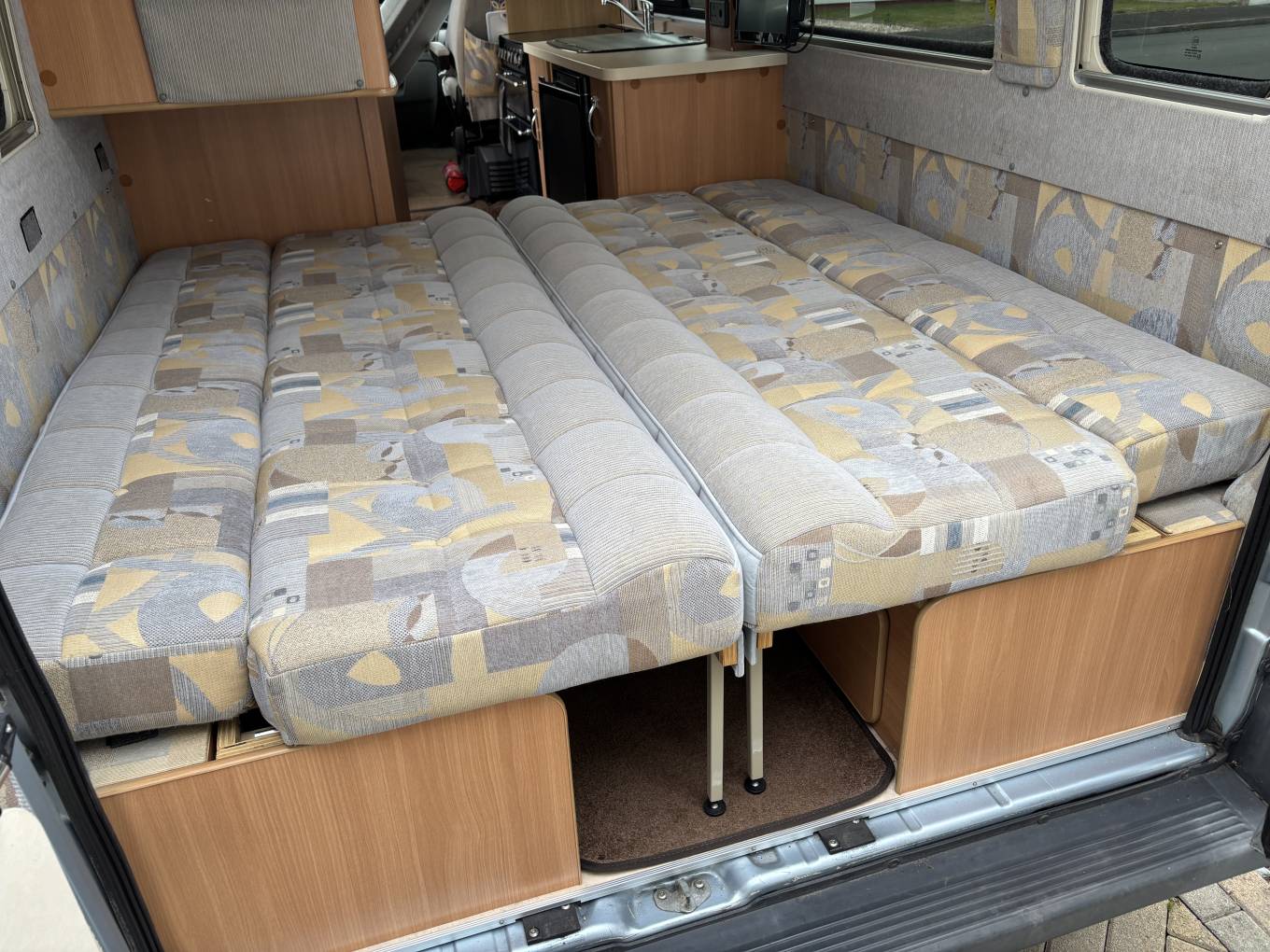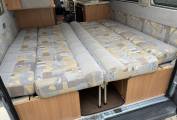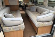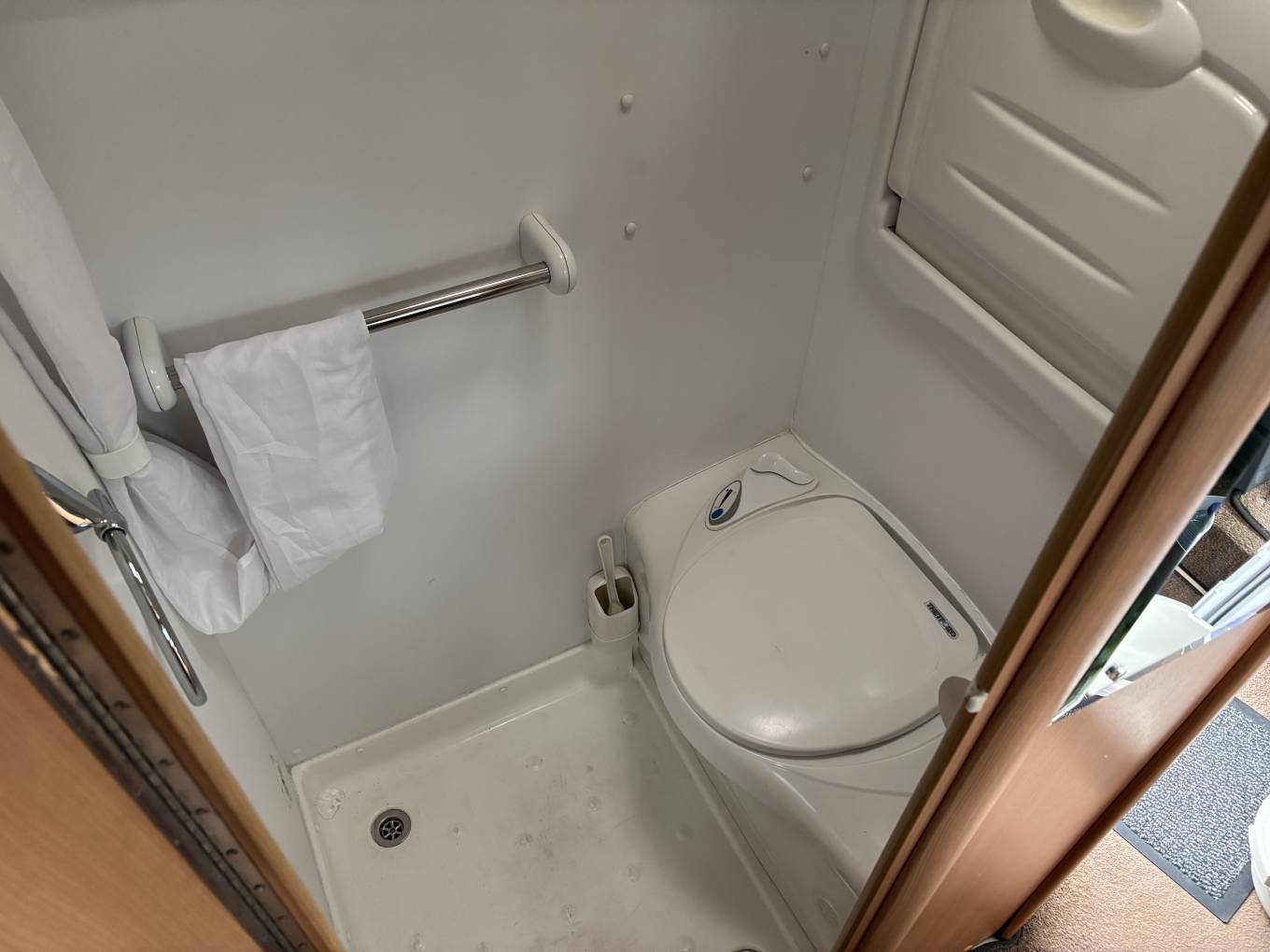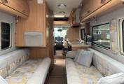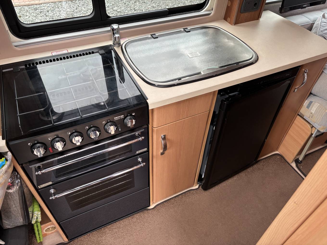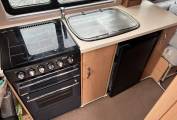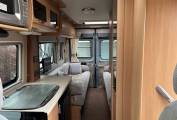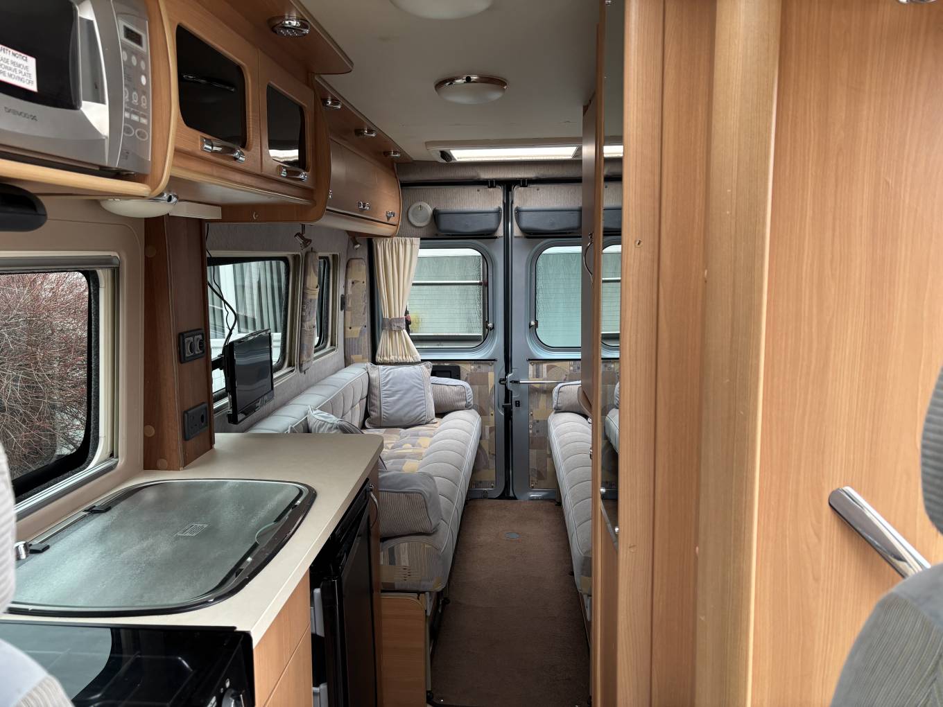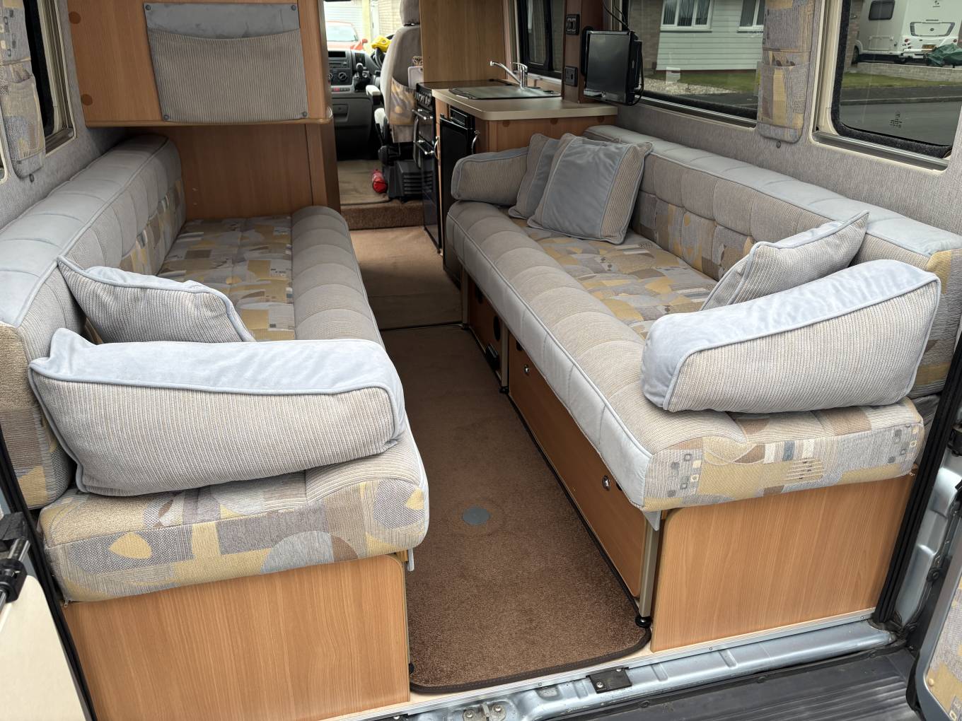 Further forward there is the kitchen which has a sink, 4 hobs, oven, grill, microwave and fridge. Opposite this is the washroom which has a shower, toilet and a handy fold down sink to save space. There is also a small wardrobe and plenty of storage space underneath the seats and in the overhead cupboards.