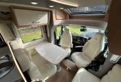 The lounge area behind the cab seats is a lovely feature and you will find the upholstery is in great condition. You have a table to help relax and enjoy each others company and you could easily sit 5 people around this area when you take advantage of the 2 front swivel seats and small side facing bench. The final sleeping area is found in the large electronic drop down bed above the lounge area and is operated with ease.