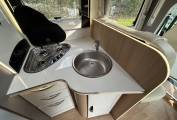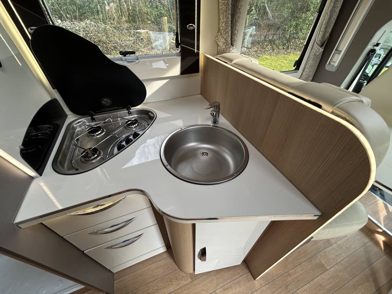 Layout - The end bedroom boasts the luxury Island bed with storage and wardrobe space, the desired separate shower cubicle can be found at the bottom of the bed and the separate washroom/toilet on the other side. The bedroom can be shut off from the rest of the motorhome if you desire. The kitchen area which is across from the habitation door to allow extra ventilation comes with 3 Gas Hobs, Hot and Cold Mixer Tap, Oven/Grill Combi, and a Large Modern Fridge with separate Freezer space.
