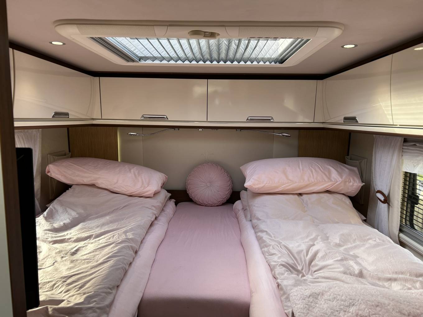 The layout is comprised of twin beds to the rear over a large garage, ensuite washroom with separate shower cubicle and toilet. Centre kitchen with large fridge/freezer, oven, grill, sink and lots of drawer/cupboard space for all your kitchen essentials. The forward dinette features an extendable table and with the cab seats swivelled a comfortable space for relaxation, dining or entertaining. There is also a large drop down bed above the cab.
