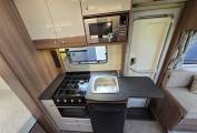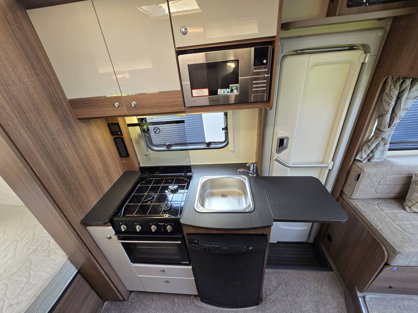 comes with a Thetford oven and grill, a three-burner gas hob, microwave, and a