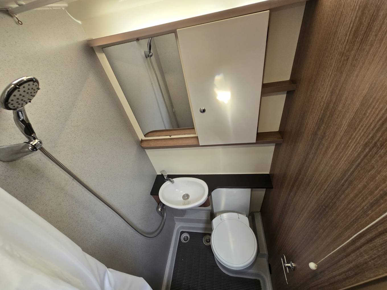 and a sink and a mirror/vanity shelves. The rear bedroom has a transverse