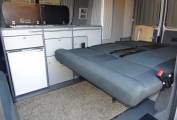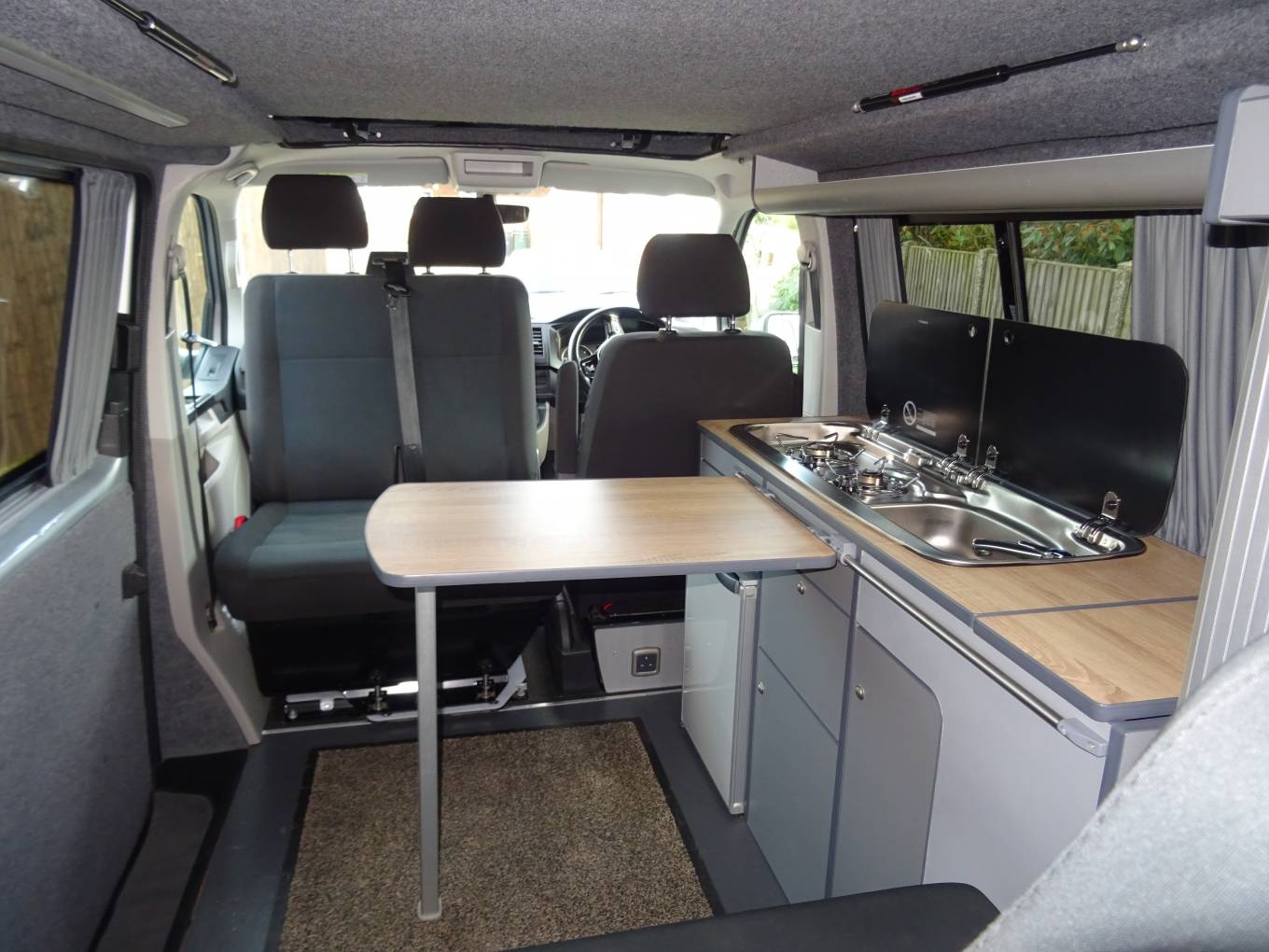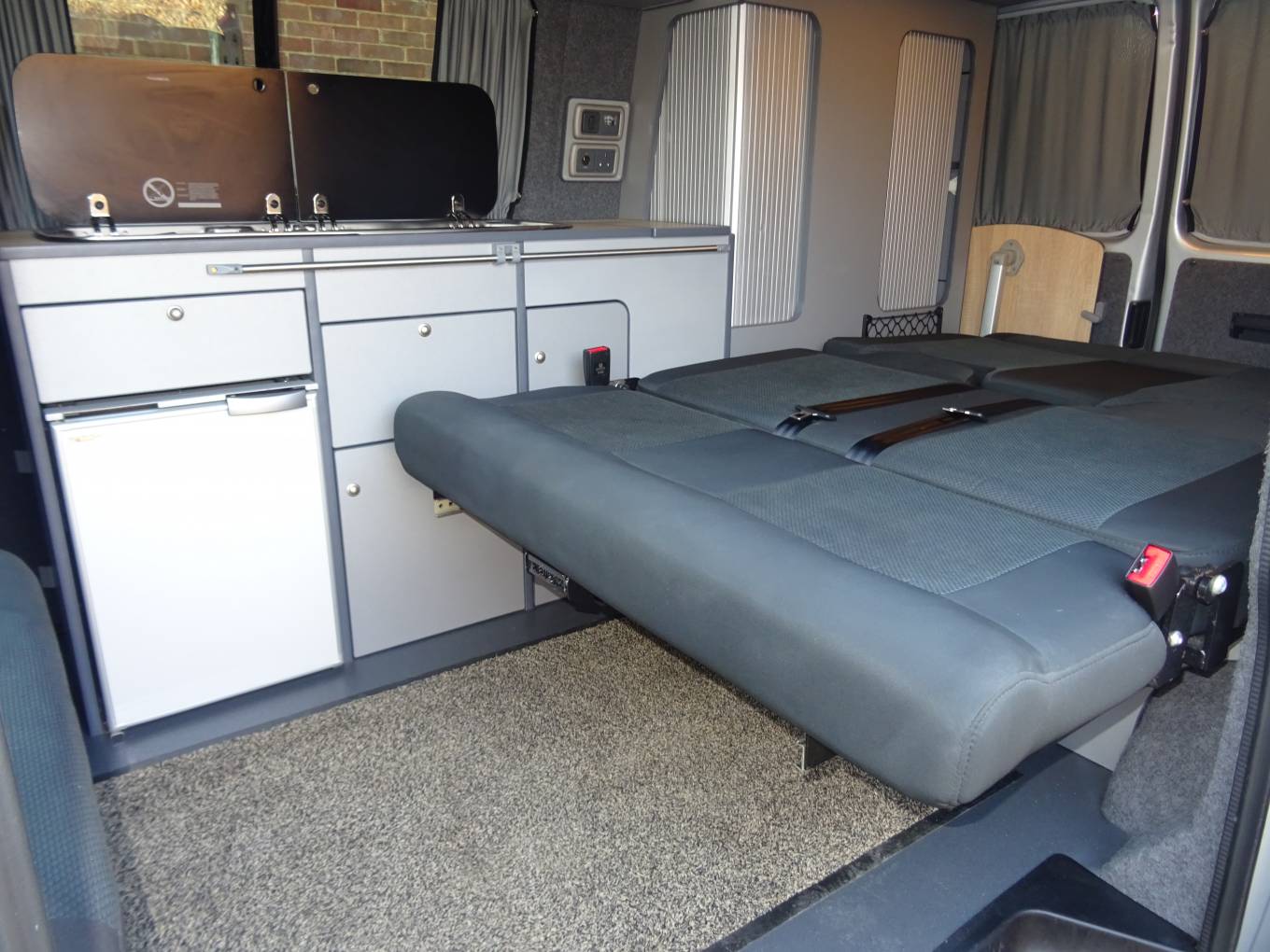 On entering the side door you have the kitchen area with sink, 2 gas rings, fridge freezer, pumped water, with worktop and good storage space. The front double seat swivels round making the central seating area very comfortable and a great socialising space. To the back, the rear seat fabworx M1 tested 3/4 rock and roll bed easily makes into a good size double bed with 2 belts and storage underneath.