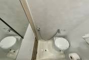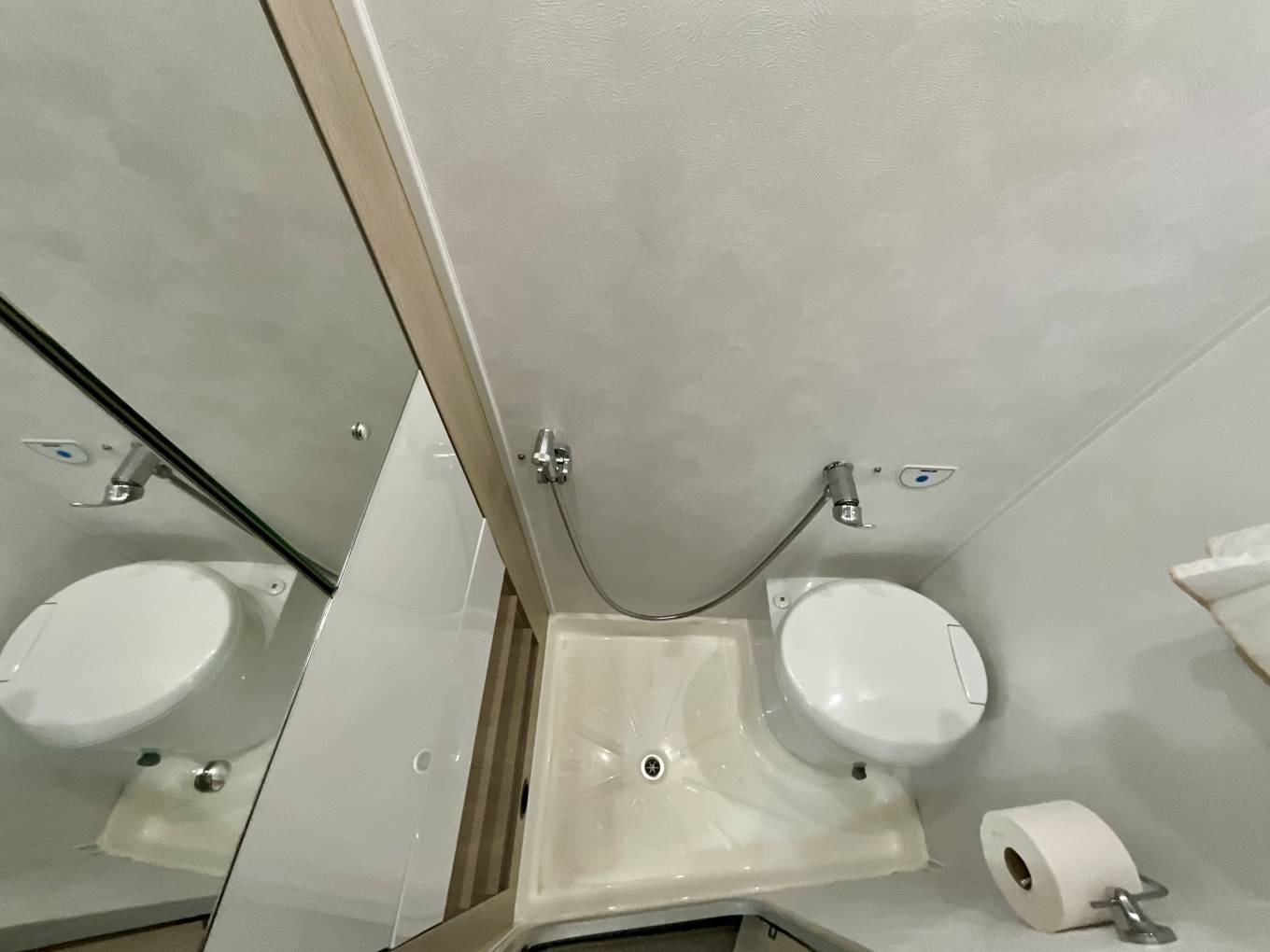 Opposite, the washroom sits with a spacious shower, Thetford toilet with cassette, fold out washbasin, vanity unit and storage.