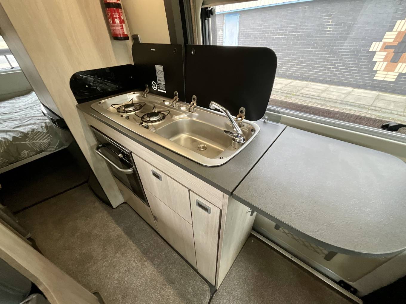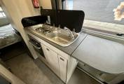 The kitchen positioned in the middle of the Toleno by the sliding habitation door is fully equipped with gas hobs, oven and grill, spacious fridge freezer and fold out preparation space for serving.