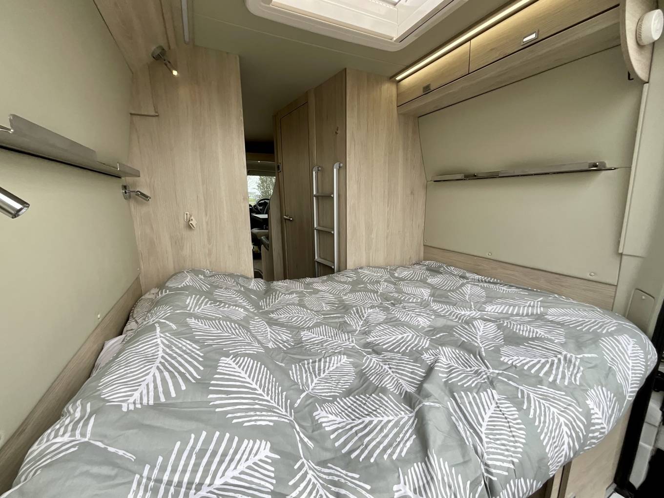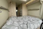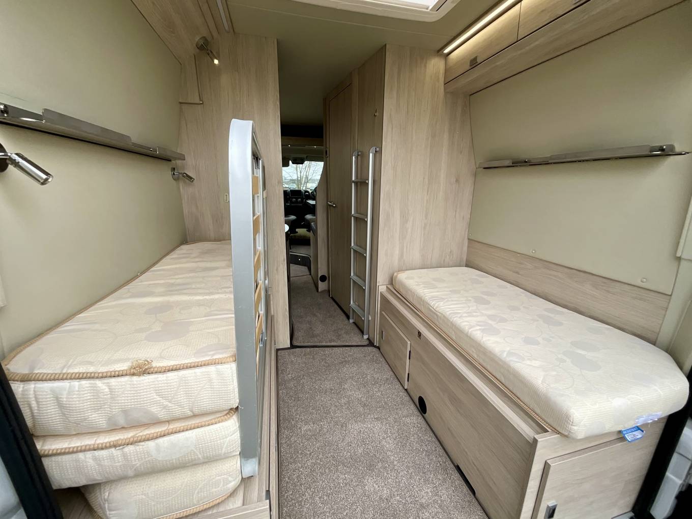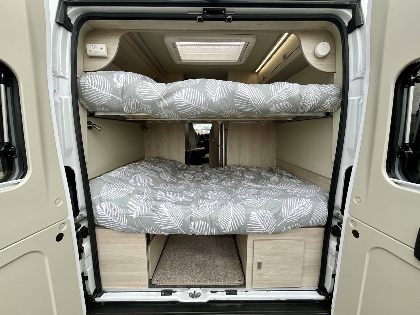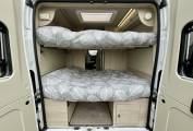 At the rear, the motorhome has a clever design feature. The two transverse beds are positioned so that one double is below and another above, however these can easily and quickly be removed to make up additional storage, or to make a garage space below the higher bed. This allows room for a large number of items including bikes, whilst leaving a transverse double bed up top. Alternatively, you can leave the lower bed in and use it as a comfortable two berth motorhome.