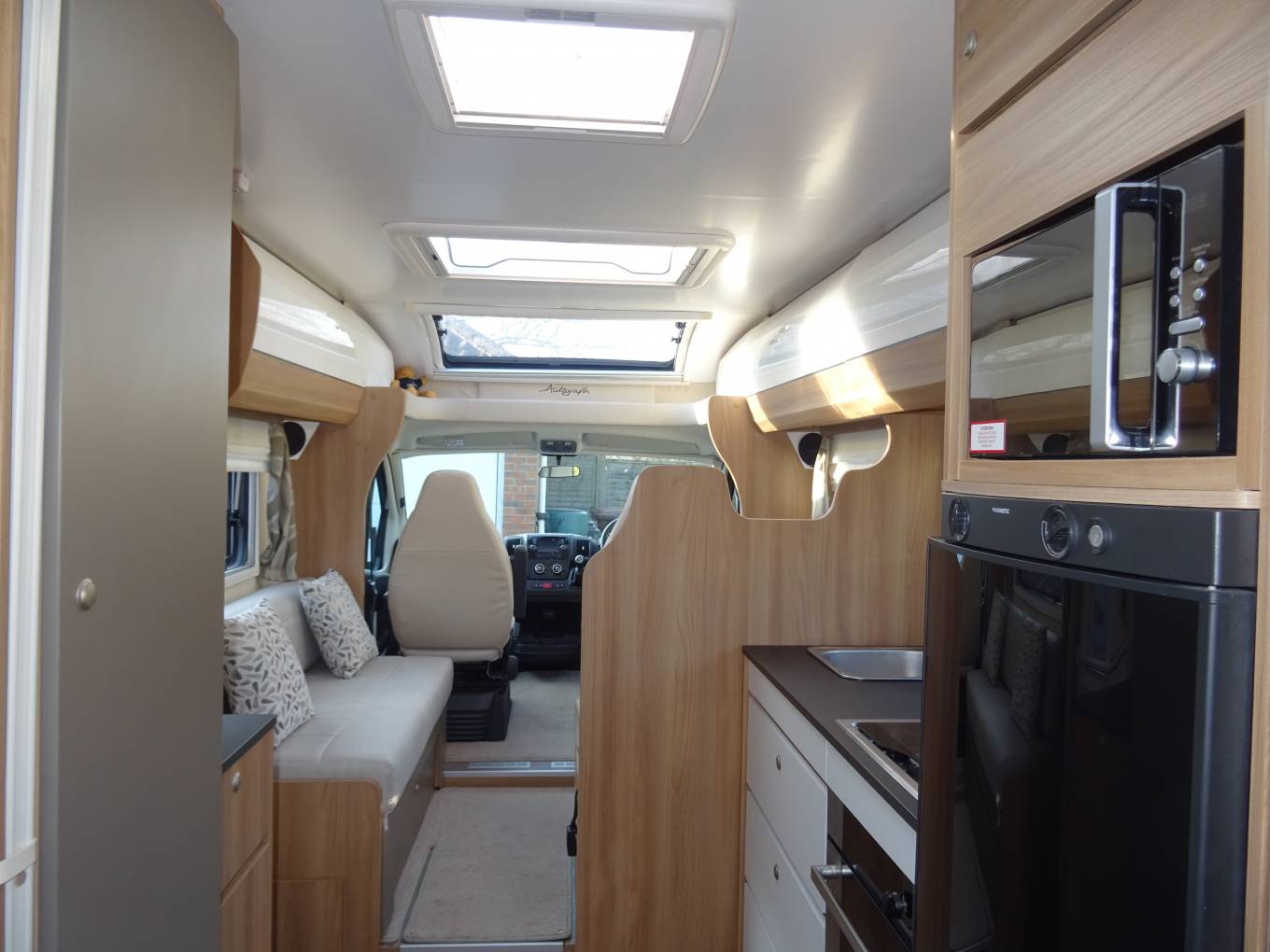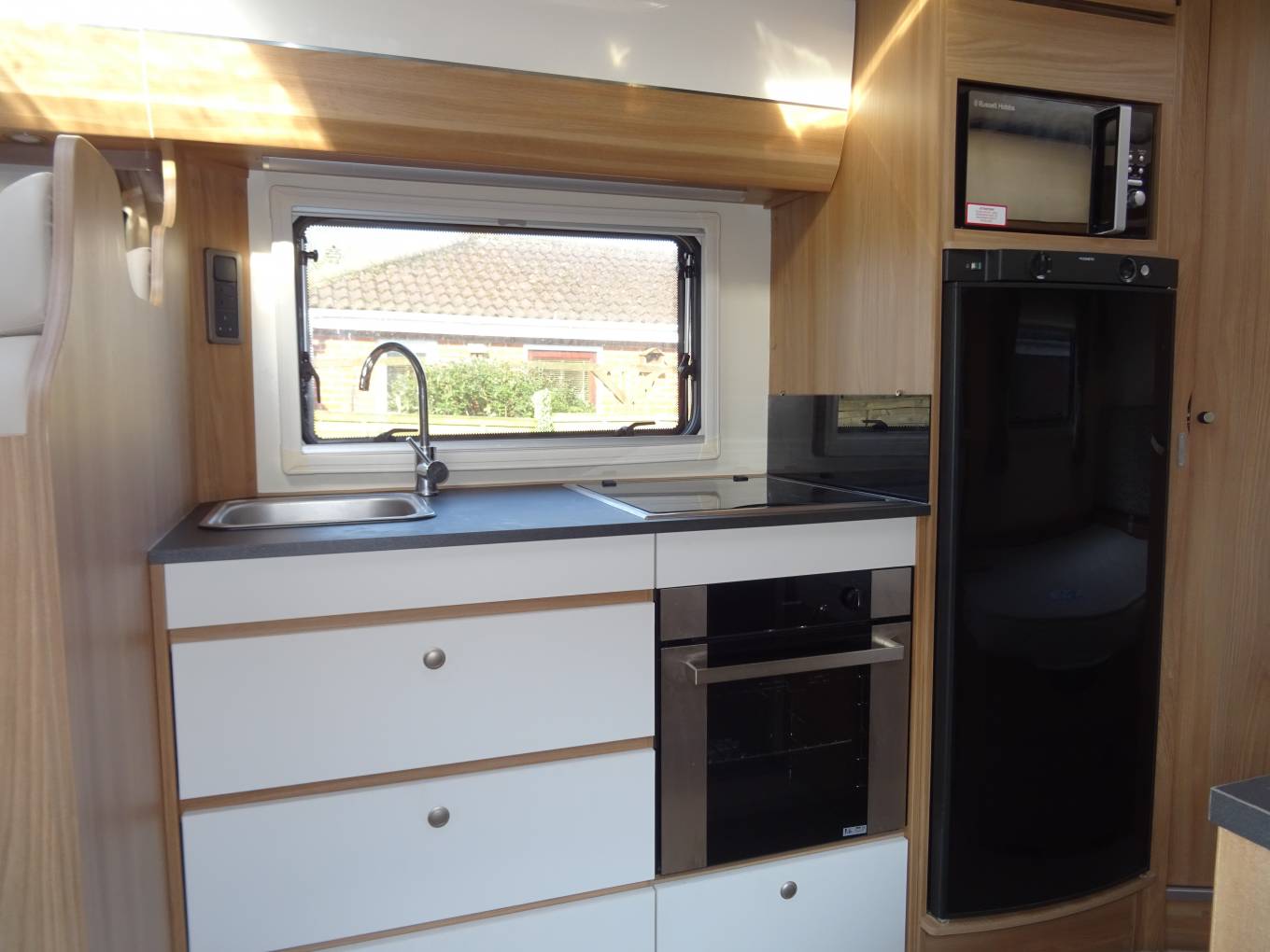 Enter through the habitation door and you have the well-equipped kitchen in front of you with a sink mixer tap; a three gas burner hob along with an electric hotplate and below combination grill and oven. You also have the microwave and below is a large 3-way fridge with seperate freezer. There is lots of good sized storage cabinets throughout.