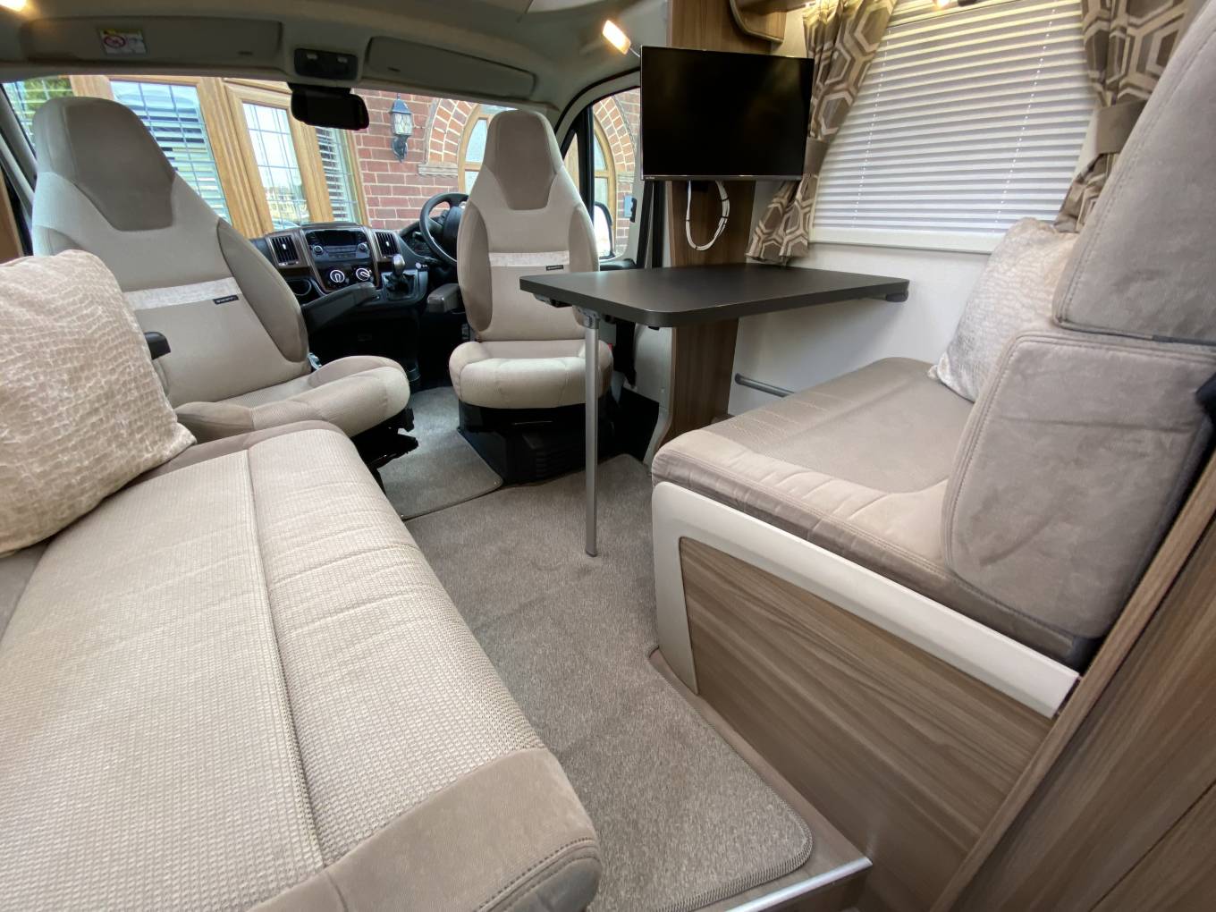 The front cab passenger and drivers captain seats both swivel round to face the