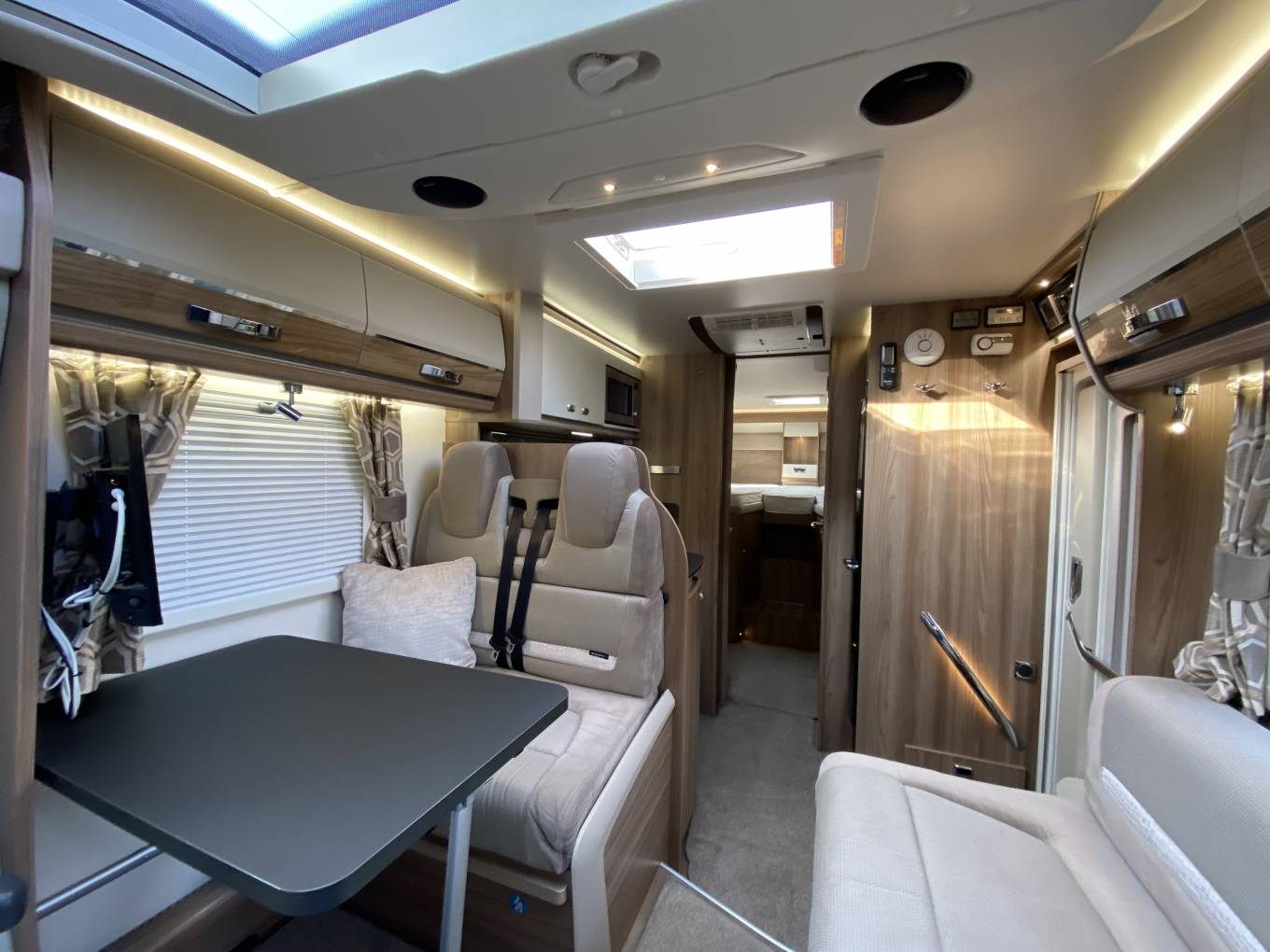 mirror. At the rear are the two rear single beds with reading lights, mains