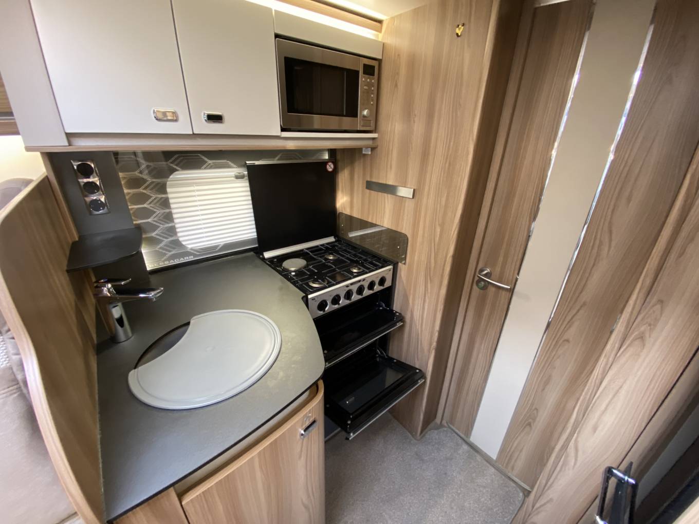 hob with electric hotplate, grill and oven below, adjacent is the Dometic tower