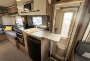 Inside, the well-thought-out layout includes a spacious rear lounge, which easily converts into a large double bed, and a drop-down overcab bed, providing additional sleeping space without compromising on daytime living space. The front dinette also transforms into another bed, making it a true 6-berth model. The kitchen is fully equipped with an oven, grill, hob, microwave, and fridge/freezer, ensuring you have everything you need to cook on the go. A modern washroom with a separate shower, toilet, and hand basin adds to the convenience.