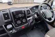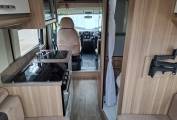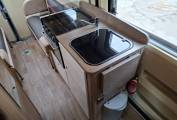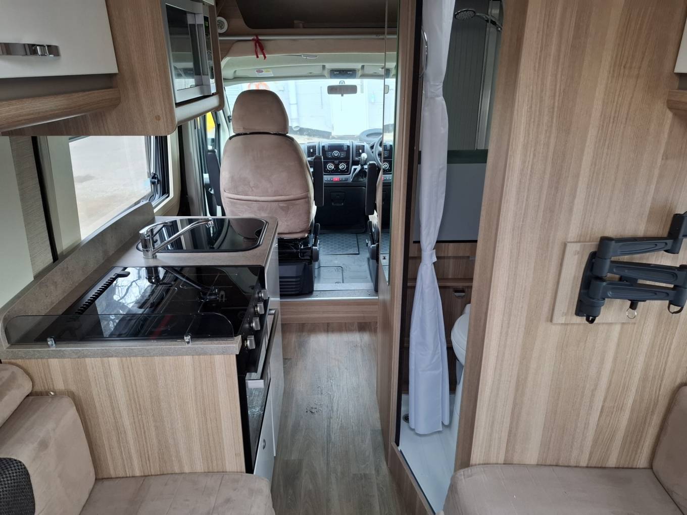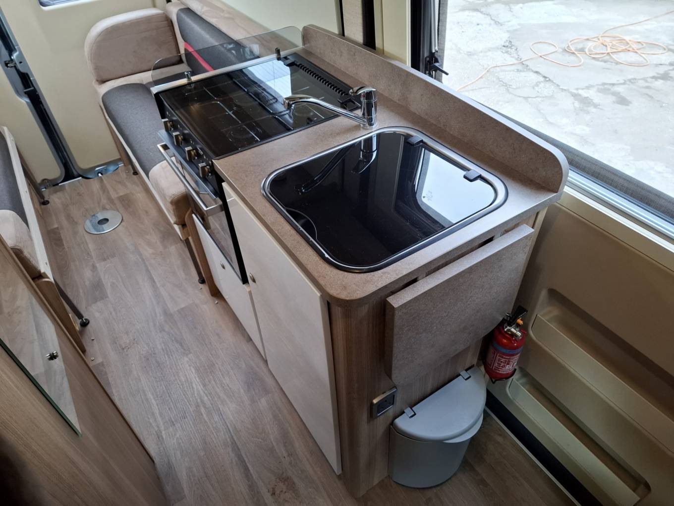 Behind the cab passenger seat is the nearside side door followed by the central galley which features a hob with 3 gas burners, a combination oven/grill, and a sink.