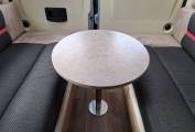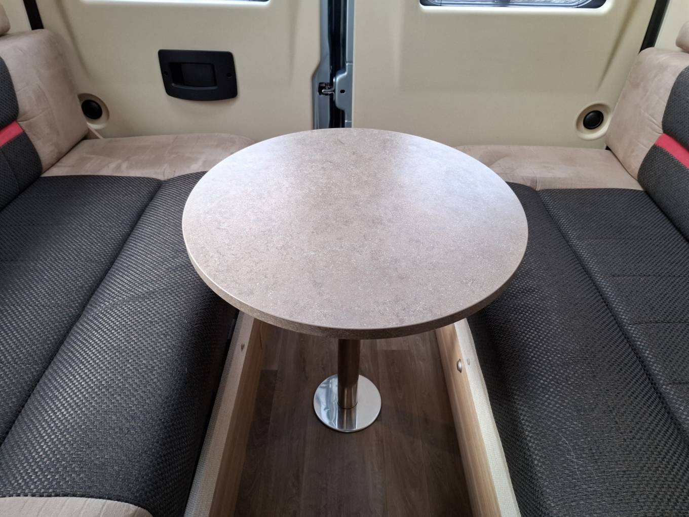 At the rear of the vehicle is a comfortable lounge comprised of opposing side sofas and a removable post-mounted circular table.